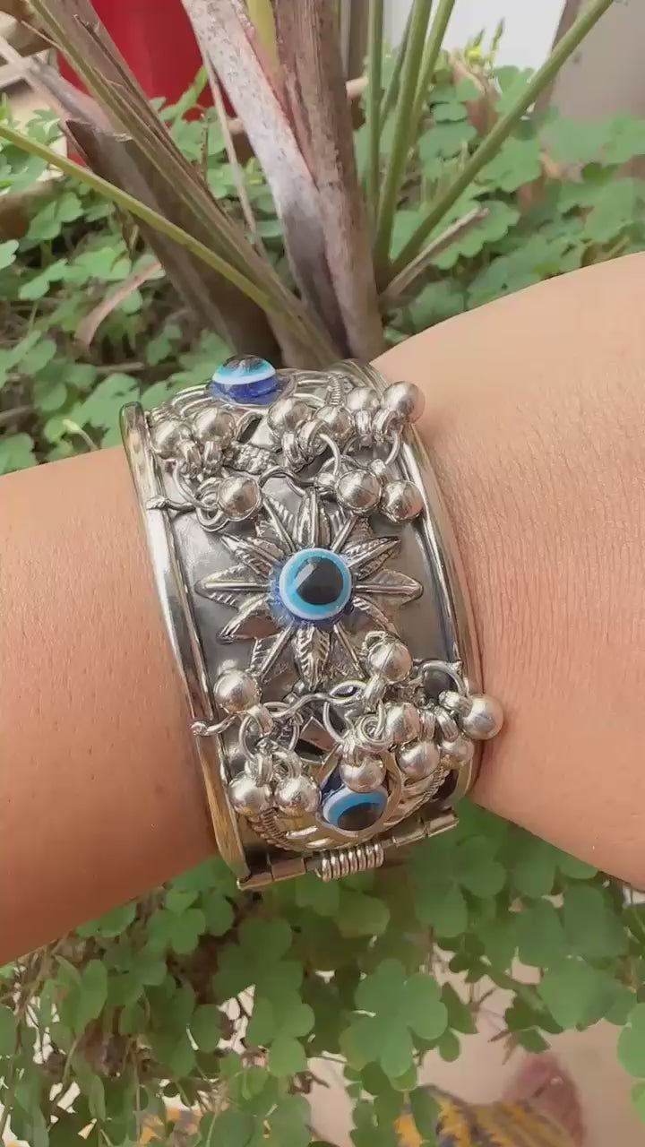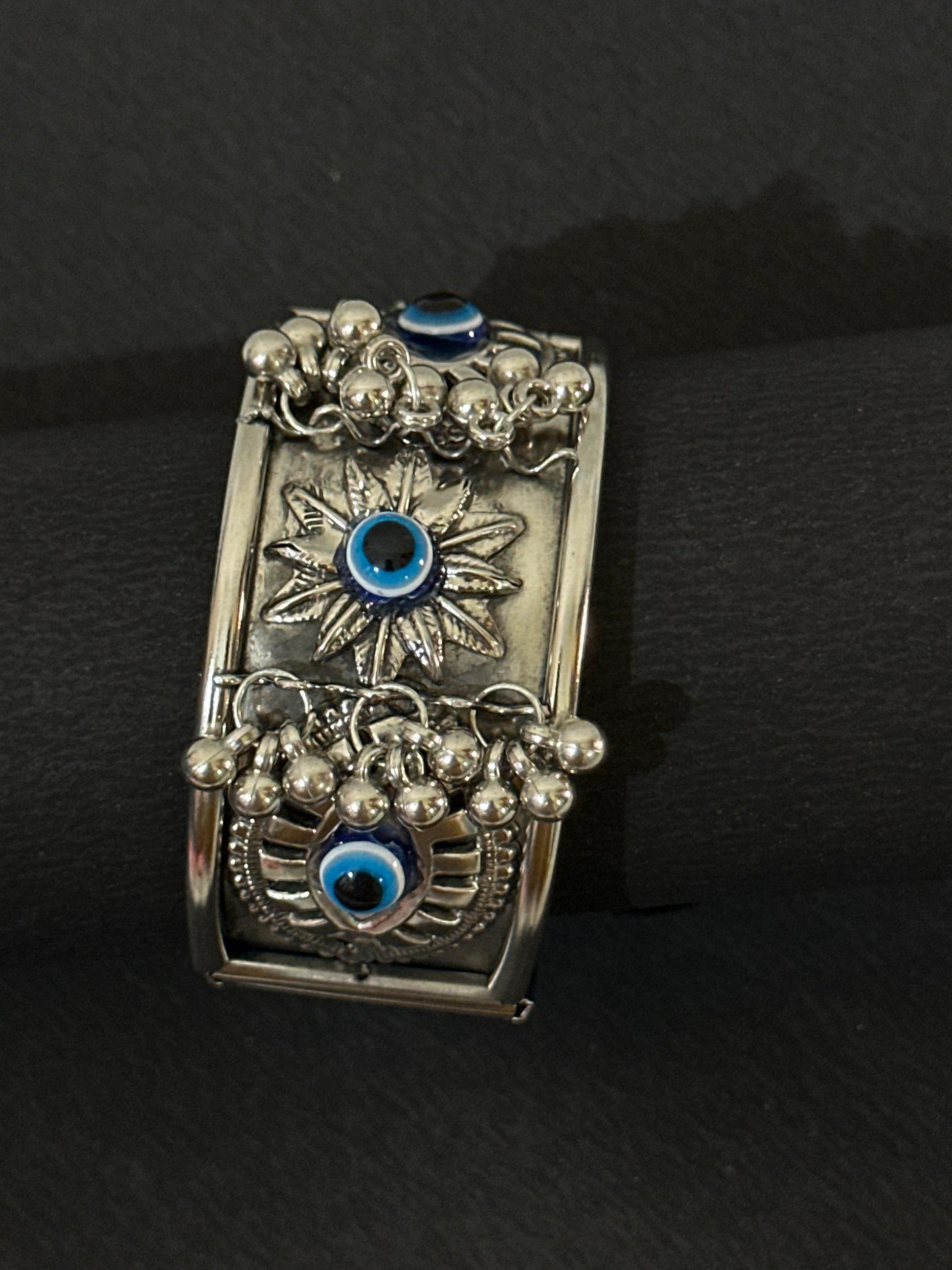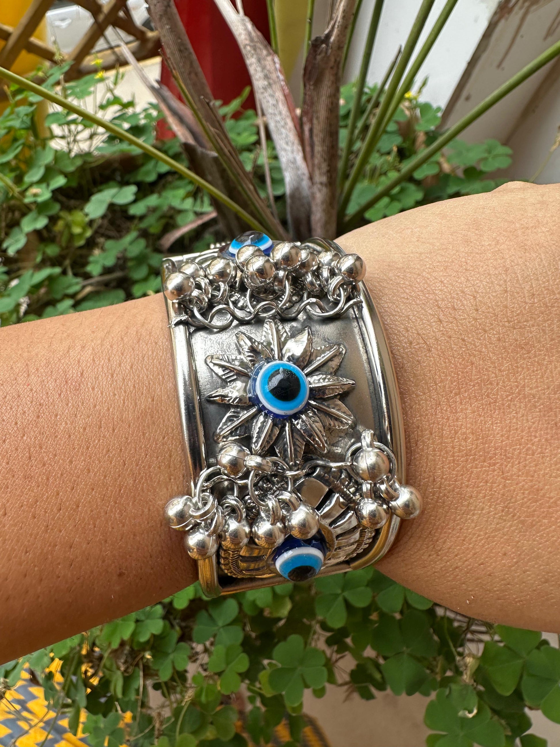 A statement kada featuring intricate antique detailing, adorned with protective evil eye charms and delicate ghungroo drops. Perfect to pair with traditional or fusion outfits, this piece adds both style and positivity to your look.