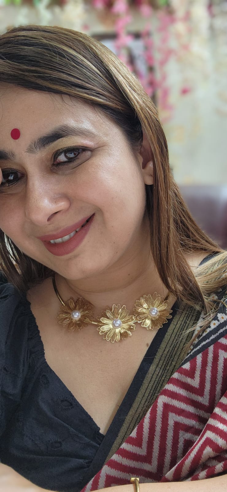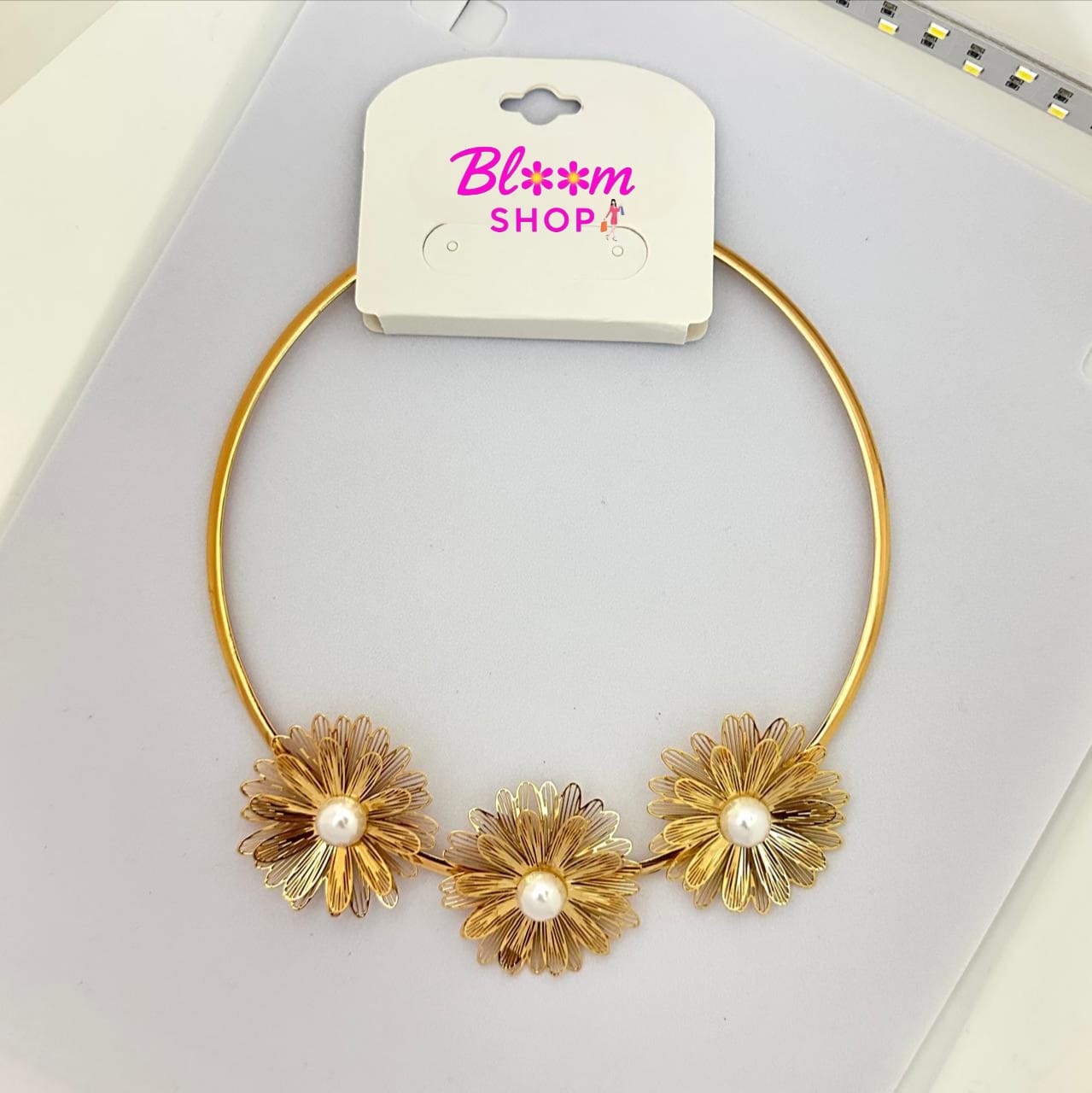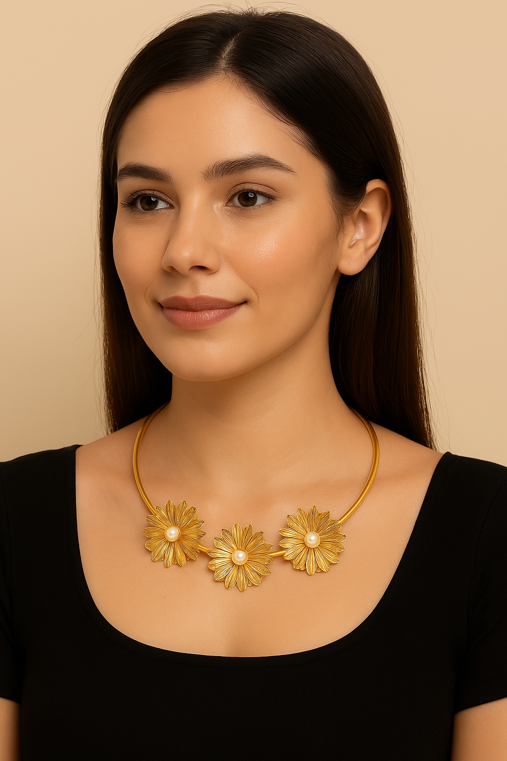Make a radiant statement with our Bloom & Pearl Choker. This contemporary design showcases three stunning golden floral motifs, each accented with a luminous pearl, on a polished gold-tone neckband. It's the perfect accessory to elevate your style and capture attention.
