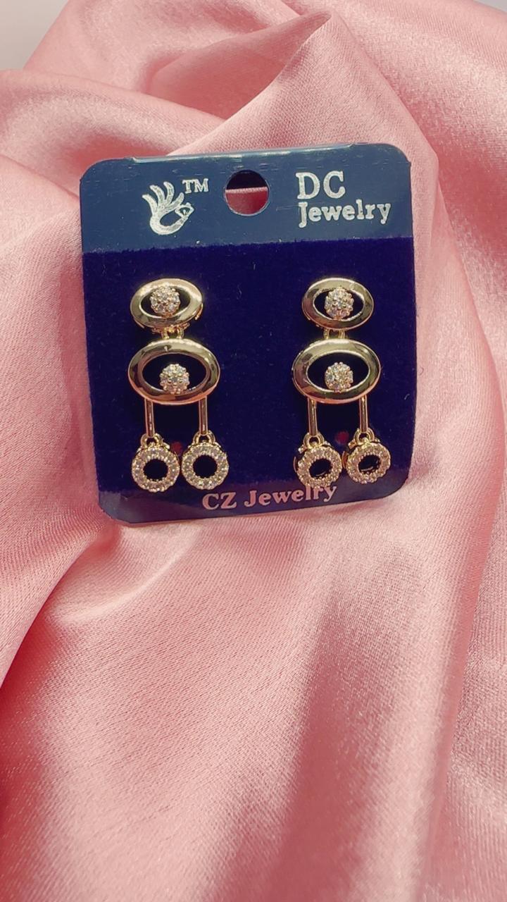 Elevate your style with the geometric allure of our Dazzling Triple Oval AD Drop Earrings. These elegant gold-toned earrings feature a series of three interconnected oval elements, each beautifully encrusted with brilliant American Diamonds. A sparkling central AD stone highlights the top oval, while the cascading design ensures maximum sparkle with every movement. Perfect for adding a modern yet timeless touch to your ensemble.