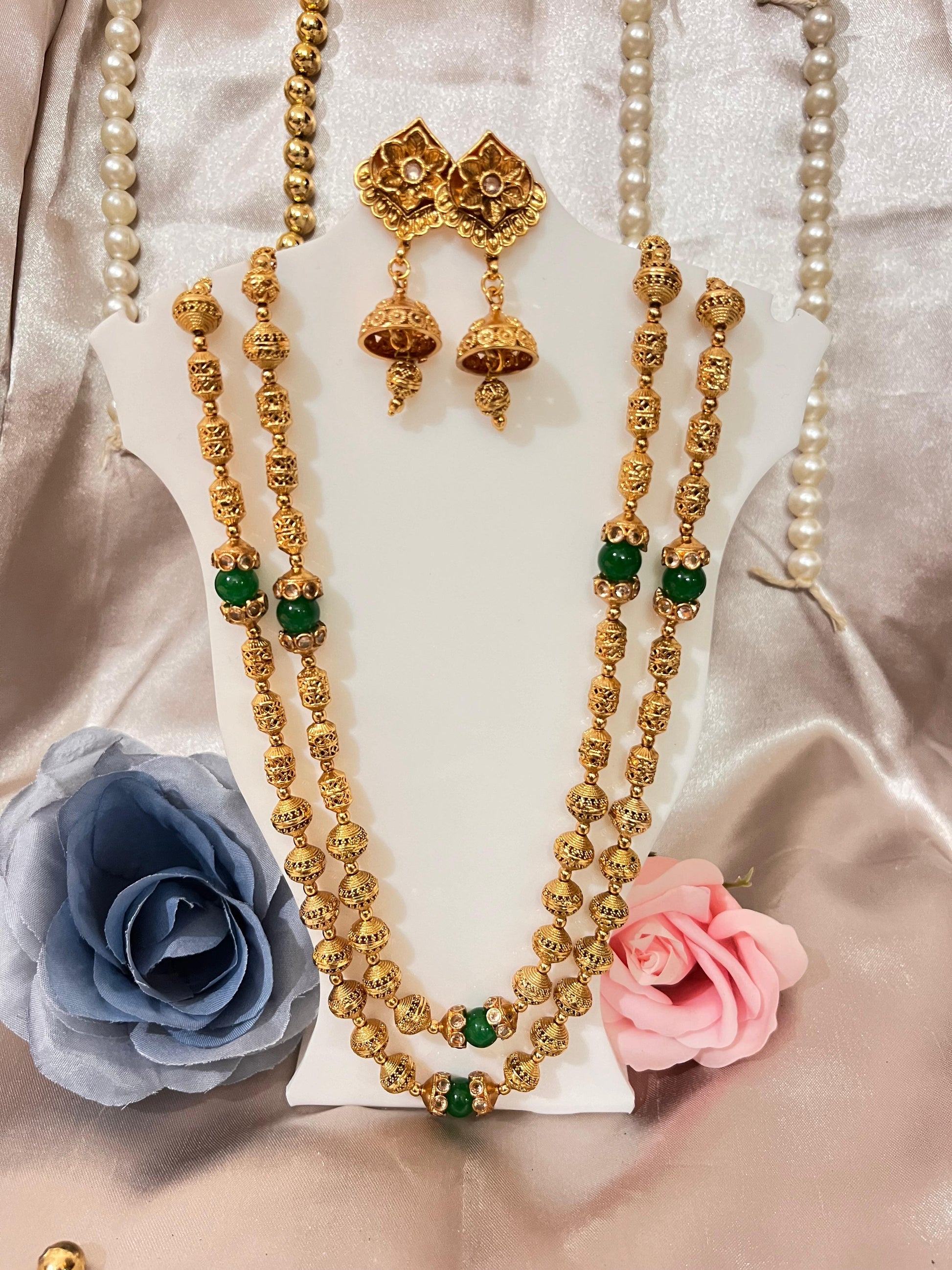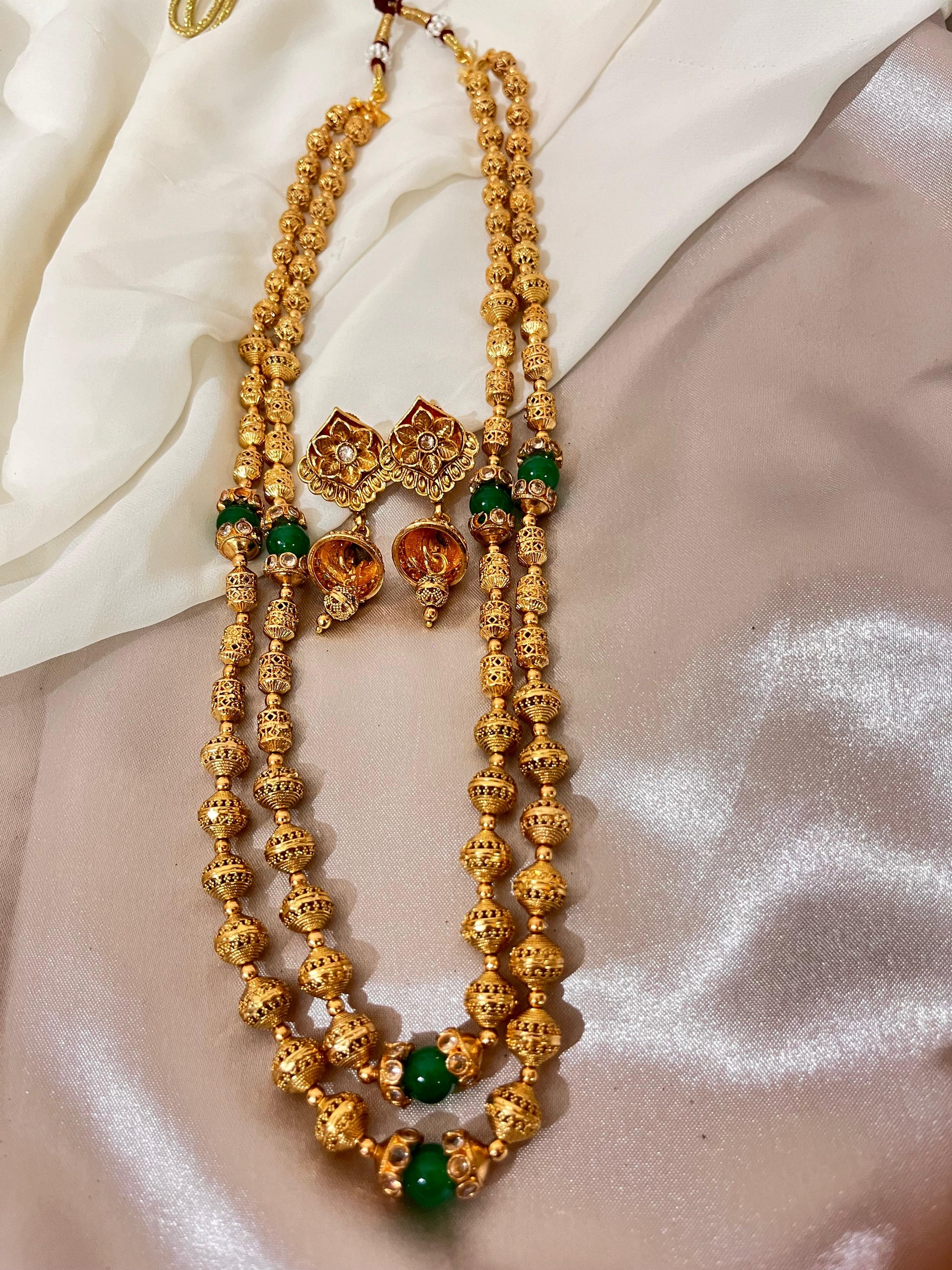 Elevate your ethnic wear with this striking double-layered gold necklace set. The necklace features a graceful flow of intricately designed golden beads, highlighted by vibrant green stone accents. The matching jhumka earrings tie the whole look together, offering a touch of traditional charm and elegance.