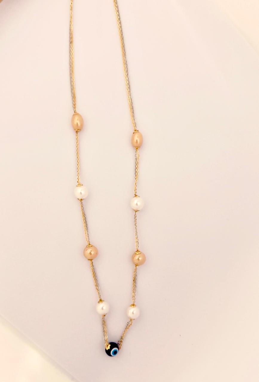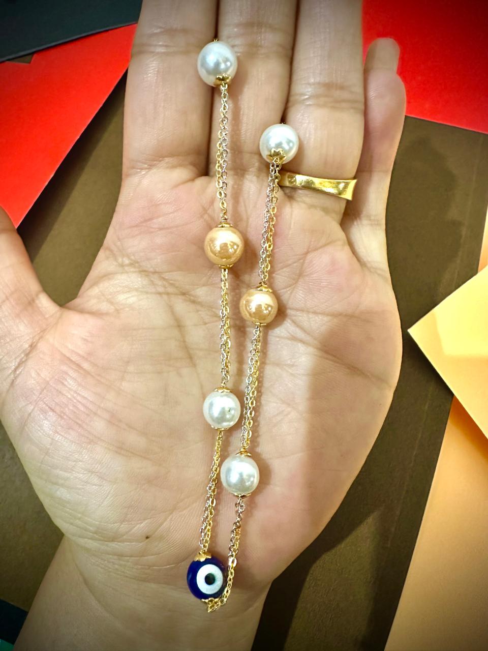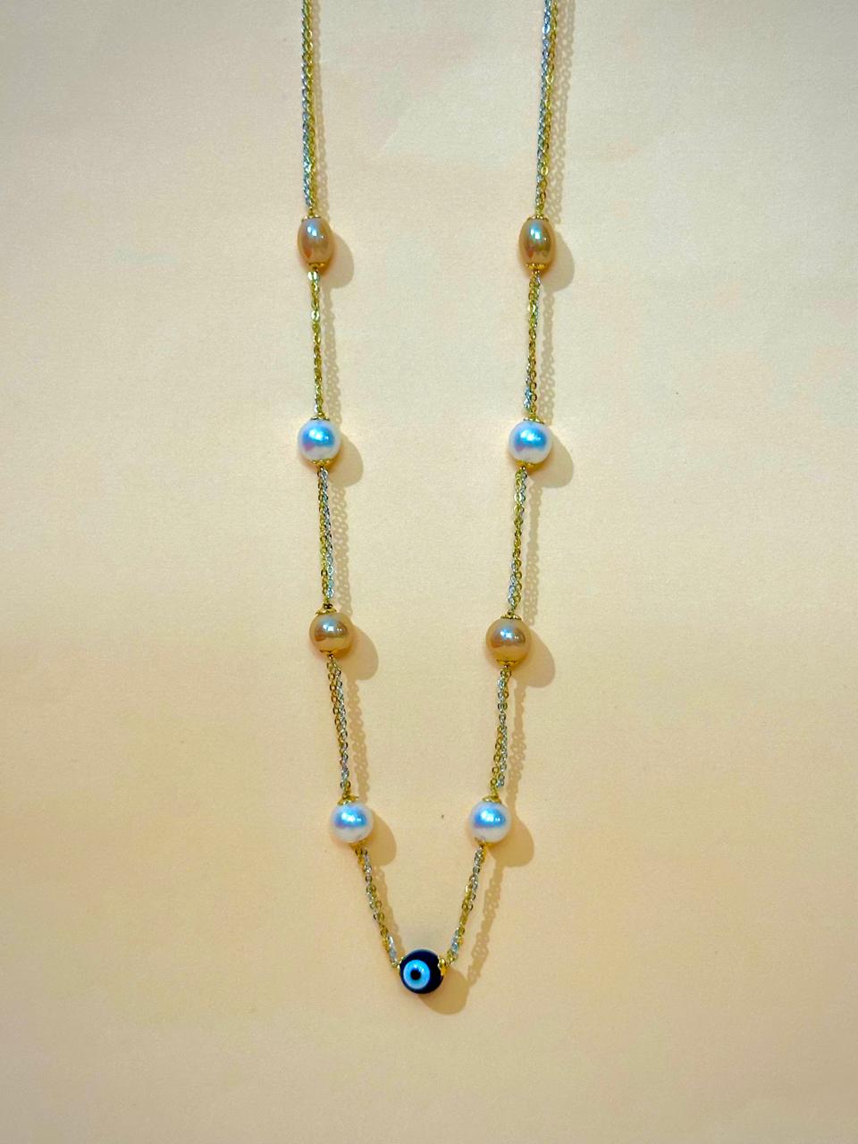 Ward off negativity with effortless style with our Golden Chain Evil Eye & Pearl Necklace. This delicate gold-toned chain features charming cream-colored and light bronze beads interspersed along its length, leading gracefully to a protective evil eye charm. This subtle yet meaningful accessory is perfect for everyday wear, adding a touch of good fortune and modern elegance to any neckline.
