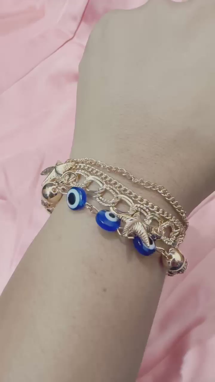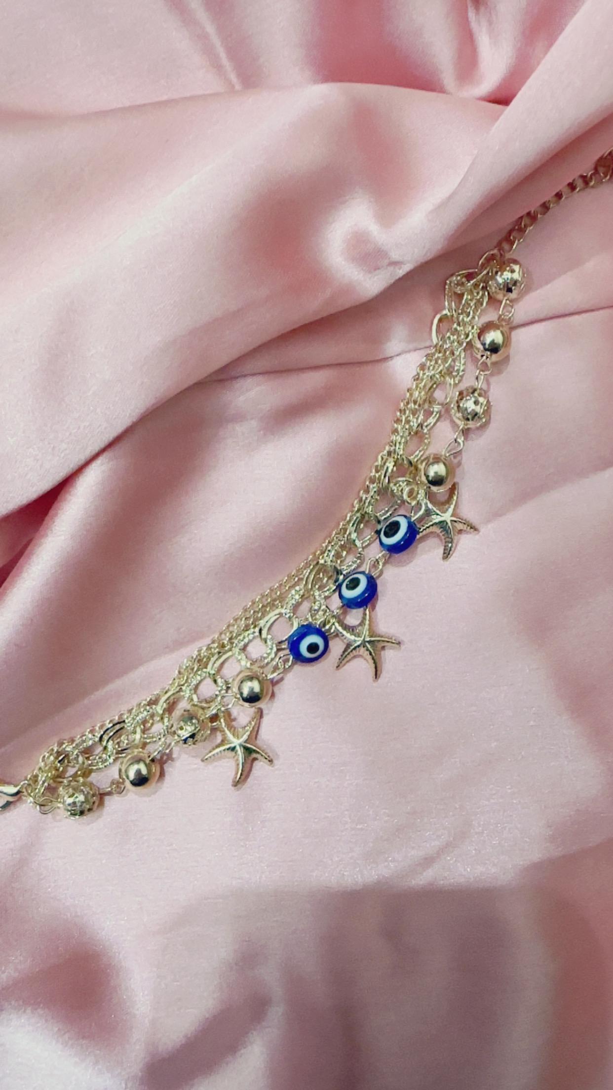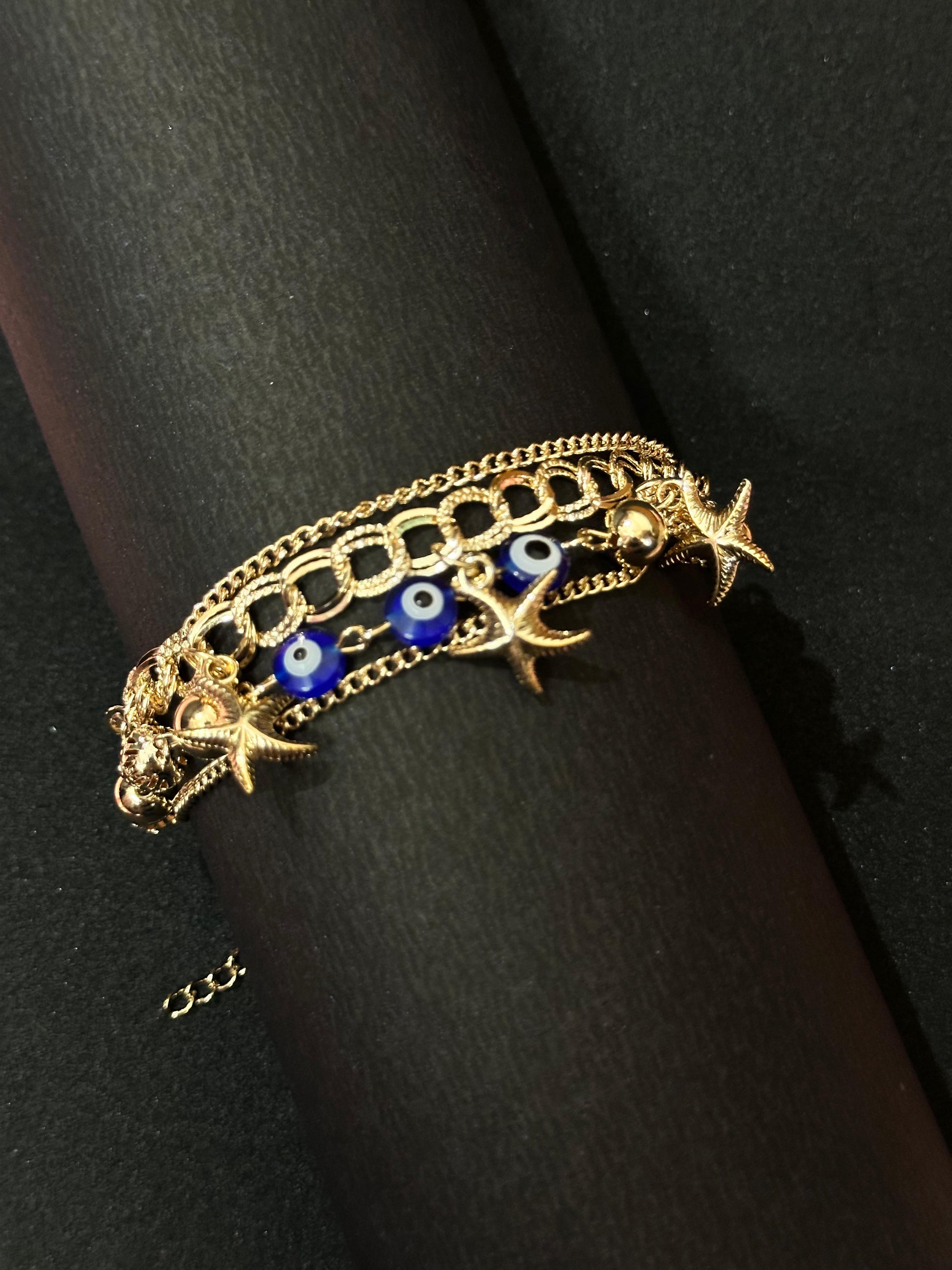 Dive into protection and style with our Golden Sea Charm Evil Eye Bracelet. This multi-layered gold-toned bracelet combines a chunky chain with delicate strands, adorned with an enchanting mix of vibrant blue evil eye charms and whimsical starfish motifs. Perfect for adding a touch of bohemian flair and good fortune to your wrist.