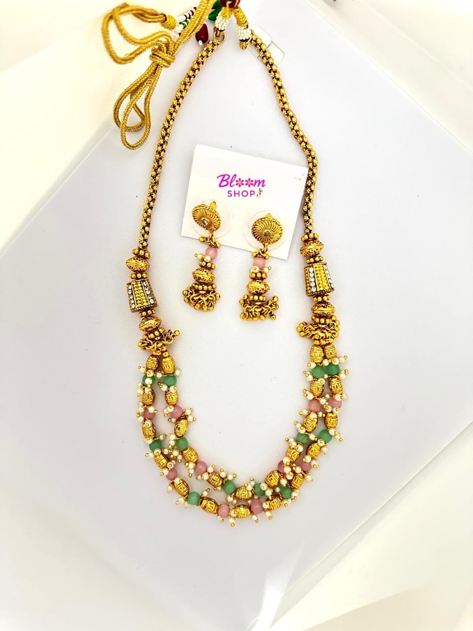 Embrace traditional elegance with our stunning Gulabi Harit Bead Temple Necklace Set. This intricate gold-tone set features a layered necklace adorned with charming pink ("gulabi") and green ("harit") beads, accented with delicate golden details and small white pearls. The matching earrings perfectly complement the necklace, making this set ideal for festive occasions, traditional wear, or adding a touch of cultural grace to any ensemble.