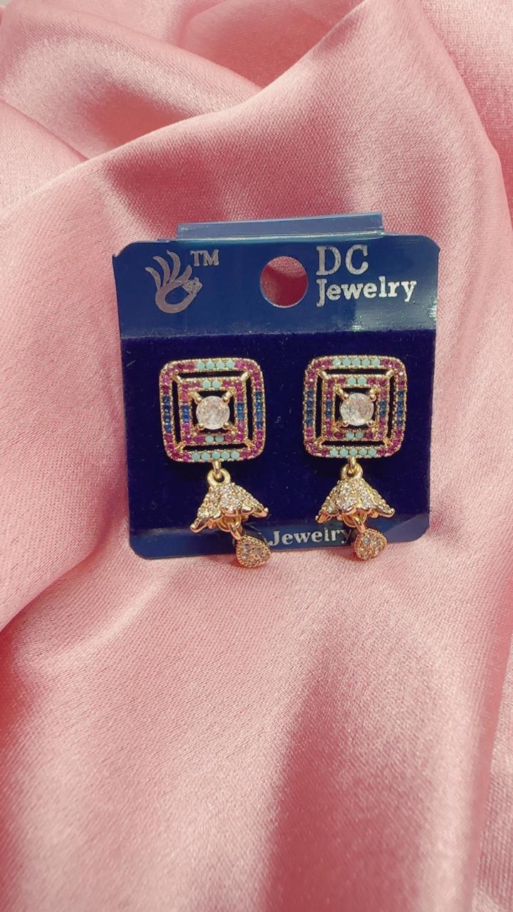 Add a burst of vibrant sophistication to your look with our Kaleidoscope AD Square Drop Earrings. These unique earrings feature a dazzling square top, intricately paved with brilliant American Diamonds in a spectrum of vibrant colors like pink, blue, and purple. A single sparkling central AD stone adds a focal point, while a delicate, textured jhumka-style drop completes this eye-catching design. Perfect for adding a festive and colorful touch to any ensemble.