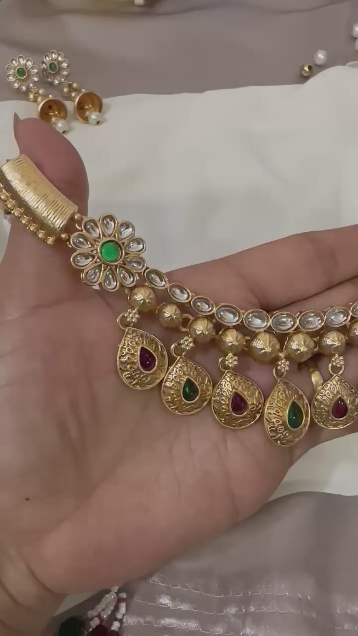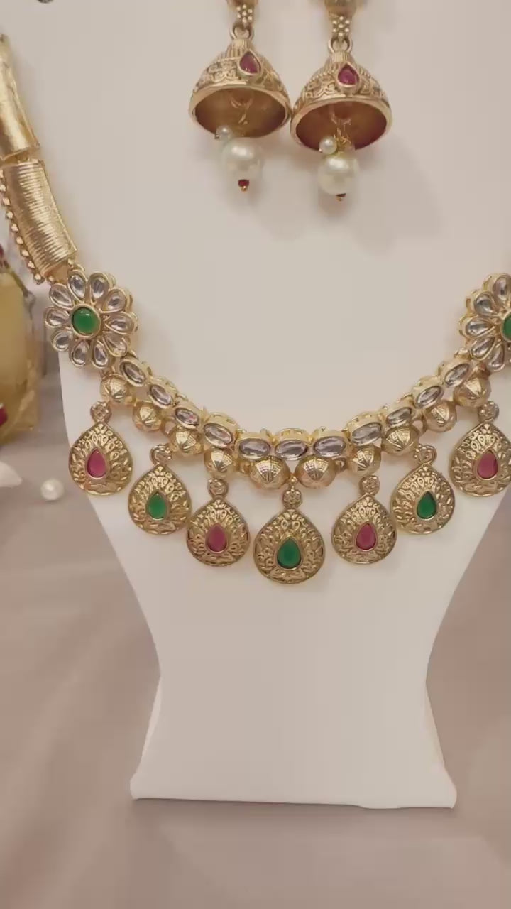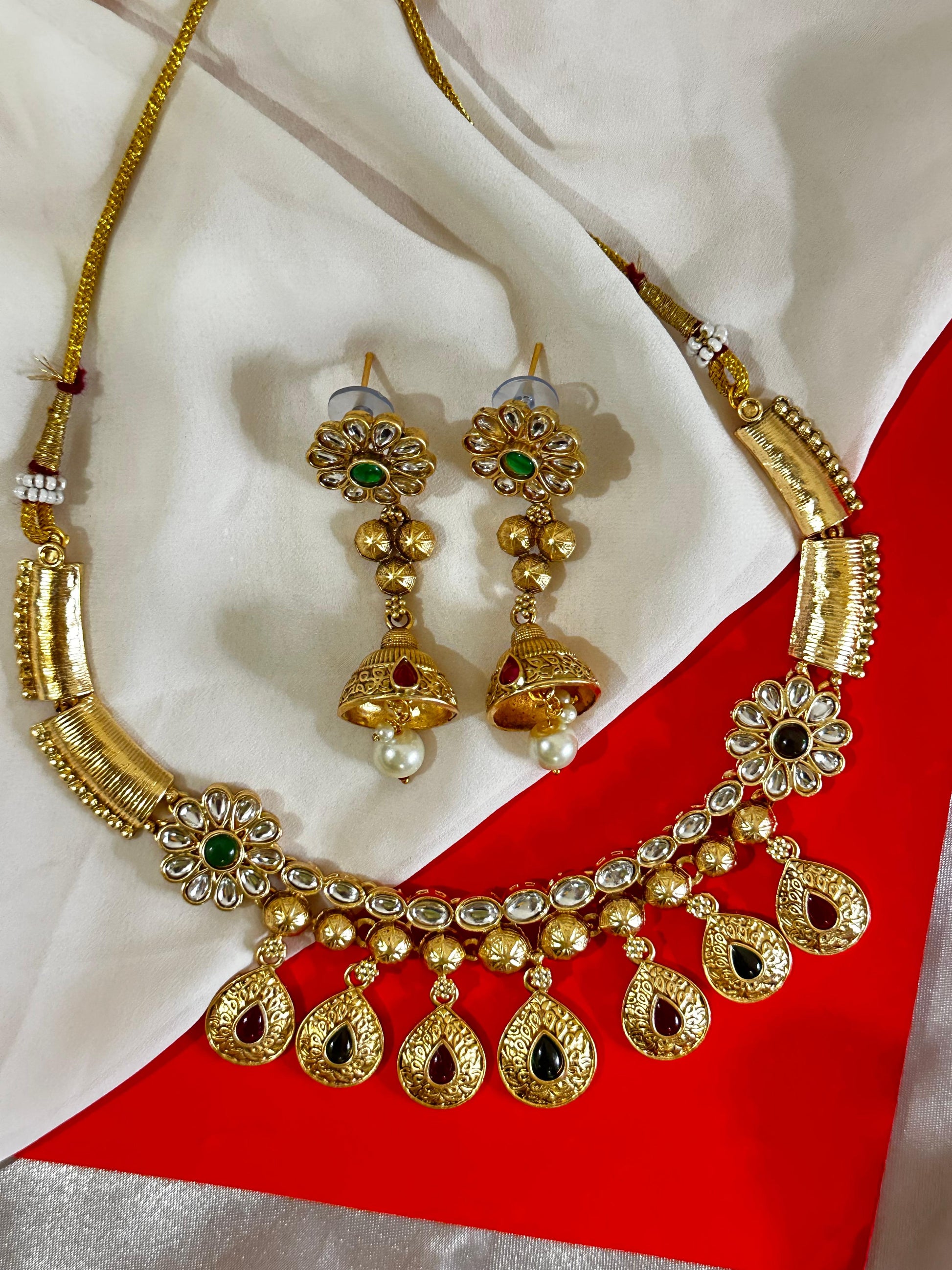 Celebrate classic beauty with this stunning gold-plated necklace set, an ode to traditional Indian craftsmanship. The choker-style necklace features intricate Kundan work with delicate floral motifs and a playful drop design adorned with red and green Meenakari accents. Paired with matching jhumka earrings, this set is perfect for adding a vibrant, elegant touch to any festive or wedding ensemble.