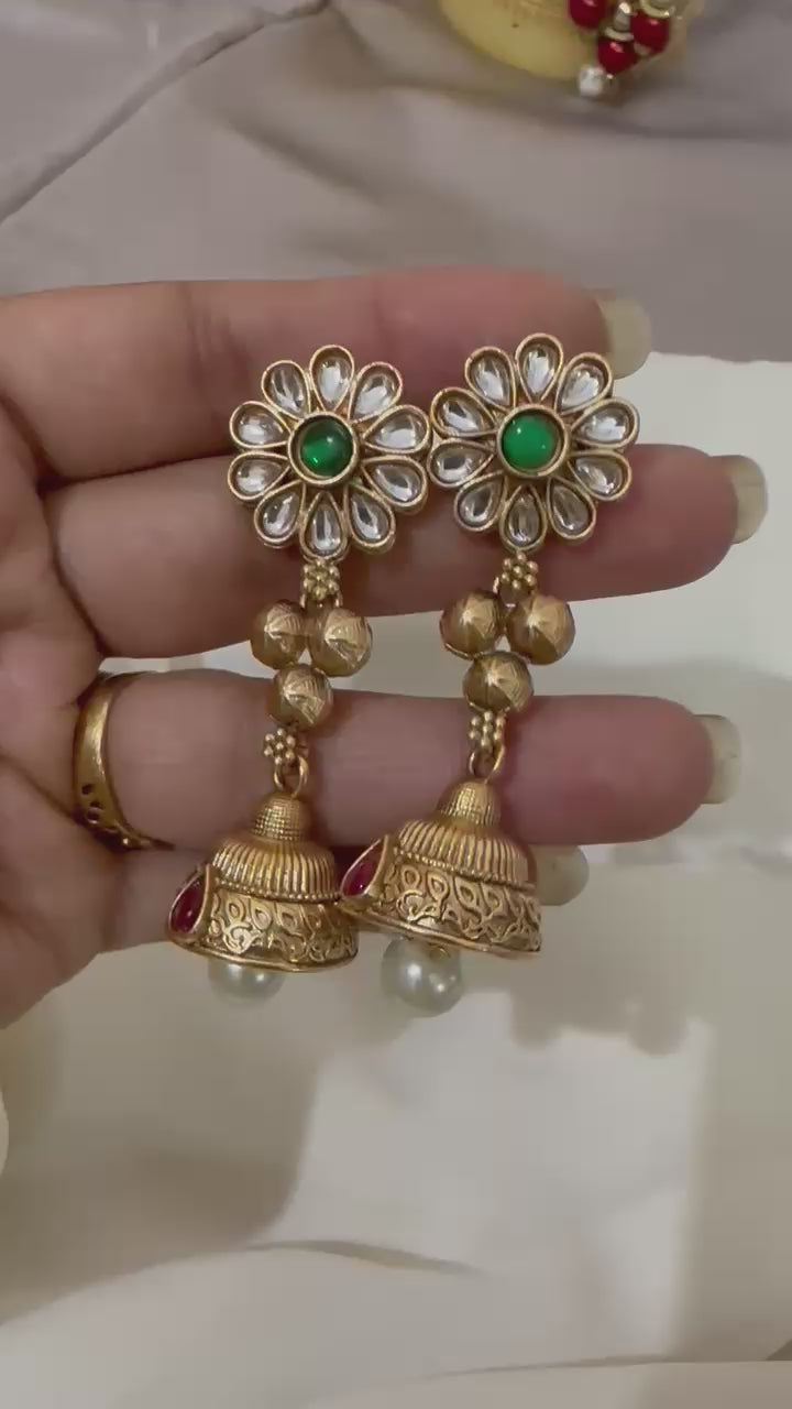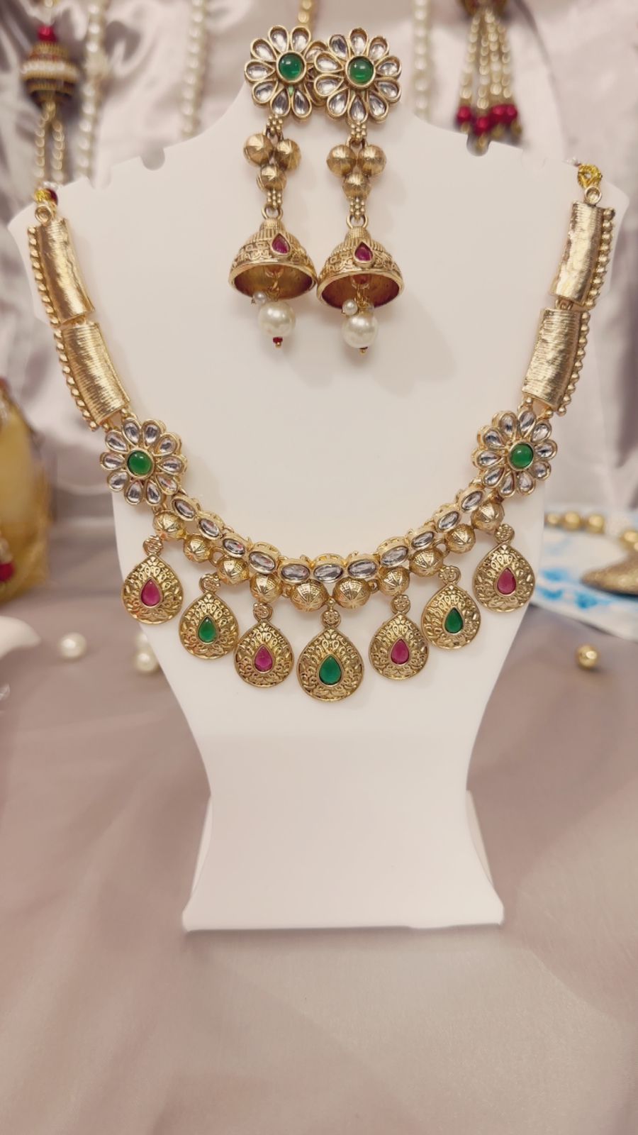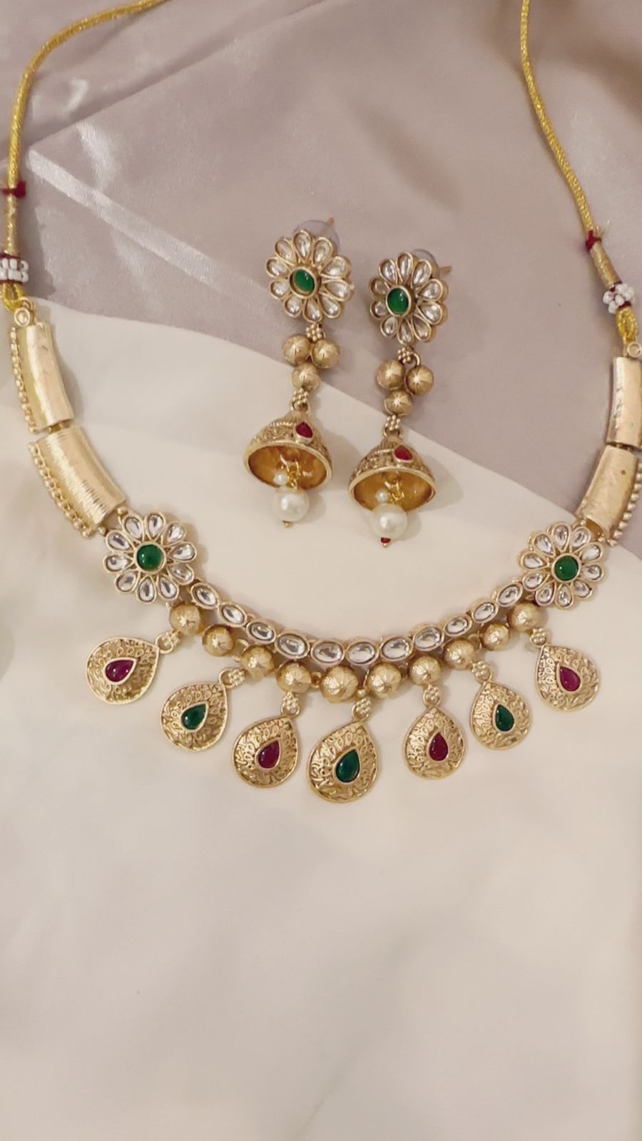 Celebrate classic beauty with this stunning gold-plated necklace set, an ode to traditional Indian craftsmanship. The choker-style necklace features intricate Kundan work with delicate floral motifs and a playful drop design adorned with red and green Meenakari accents. Paired with matching jhumka earrings, this set is perfect for adding a vibrant, elegant touch to any festive or wedding ensemble.