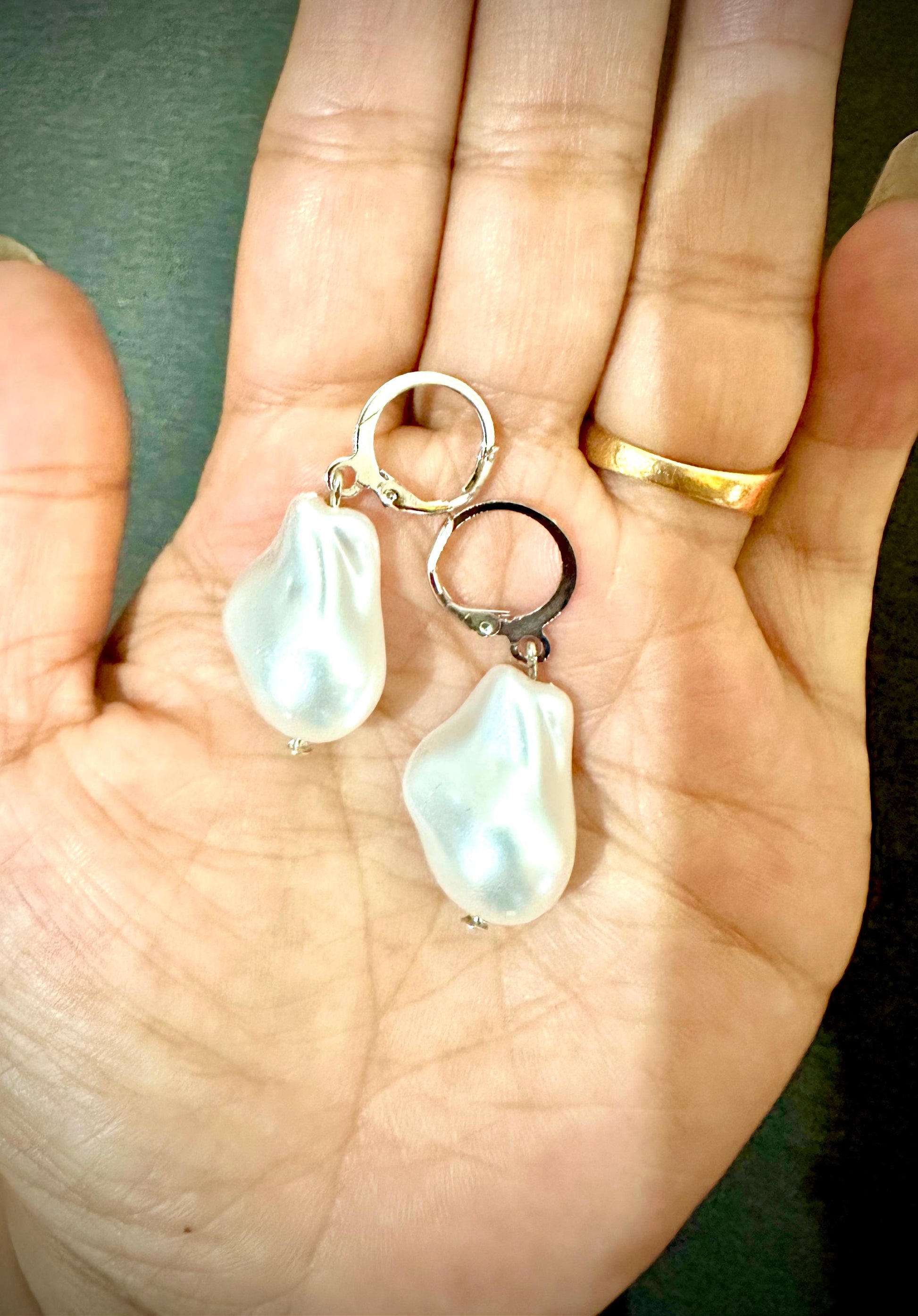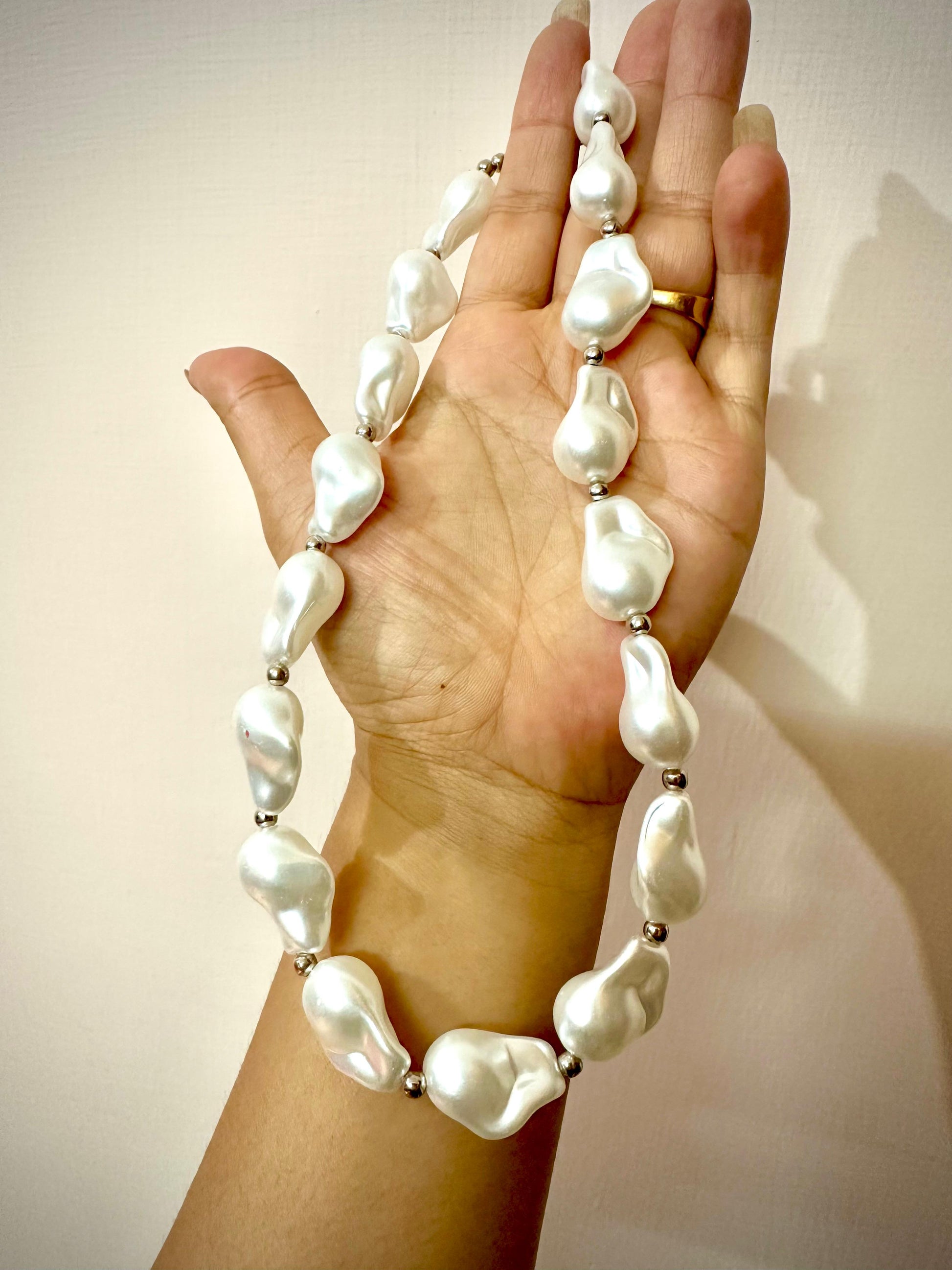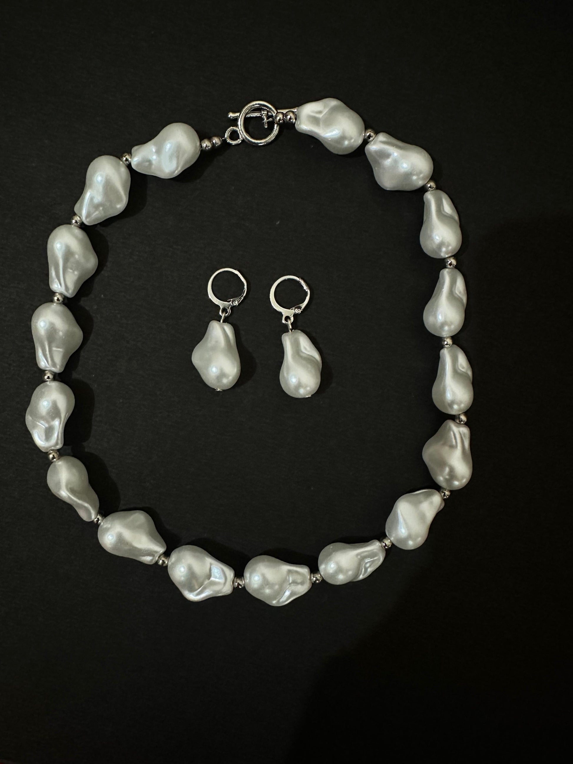 Embrace organic elegance with our Luminous Baroque Pearl Choker Set. This stunning set features a chunky choker necklace crafted from beautifully irregular, lustrous baroque pearls, each separated by small silver-toned beads. The unique shapes of the pearls add a contemporary edge to classic sophistication. Completing the set are matching drop earrings with a single baroque pearl, perfect for adding a touch of modern artistry and ethereal glow to any ensemble.