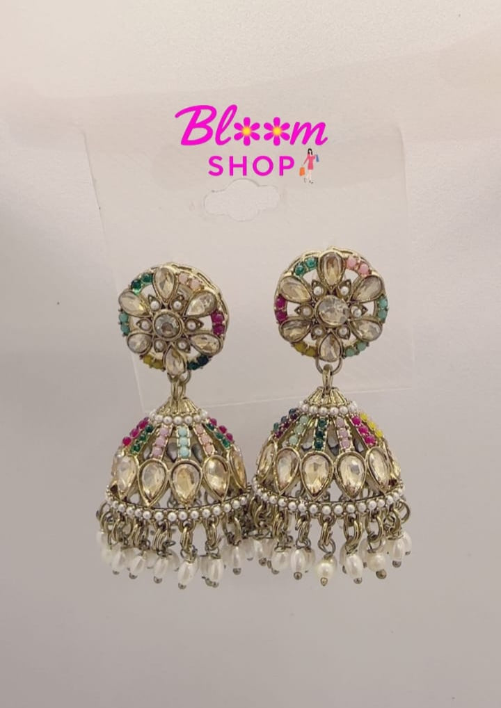 Make a royal statement with these exquisite Meher Multi-Stone Kundan Jhumkas, intricately crafted with teardrop kundan stones and vibrant multicolored enamel accents. The delicate pearl droppings and floral stud top add grace and charm, making them perfect for weddings, festive occasions, or ethnic glam nights.