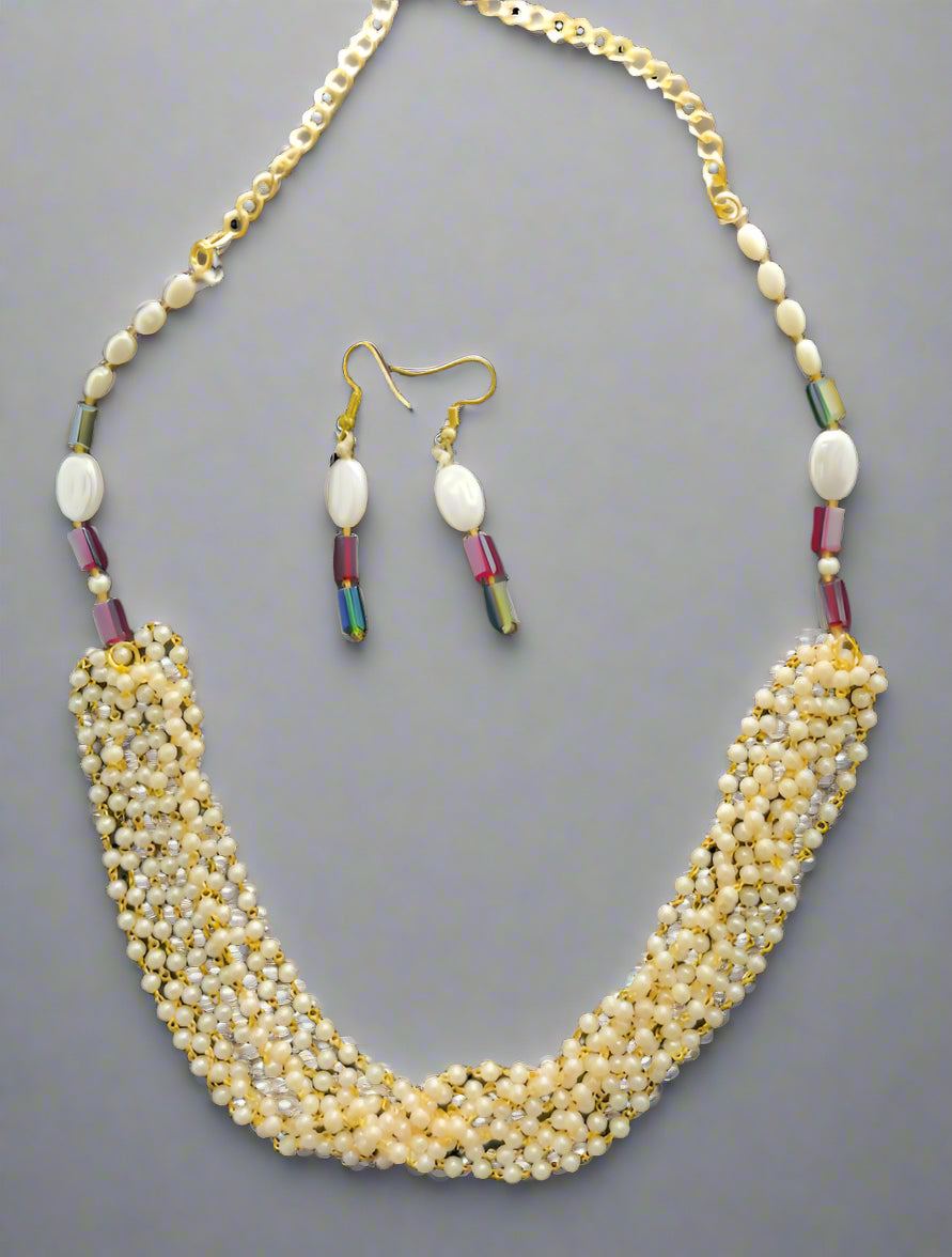 Elegance cascades with our Multi-Strand Pearl & Jewel Cascade Set. This captivating necklace features a luxurious array of eight delicate chains, richly adorned with lustrous tiny pearls that form a beautiful, full silhouette. The design is artfully punctuated by iridescent white, deep ruby, and emerald-hued beads, leading to a classic golden chain. The accompanying earrings echo this enchanting mix of pearls and vibrant jewel-toned beads, making this set a sophisticated choice for special occasions or to elevate your everyday glamour.
