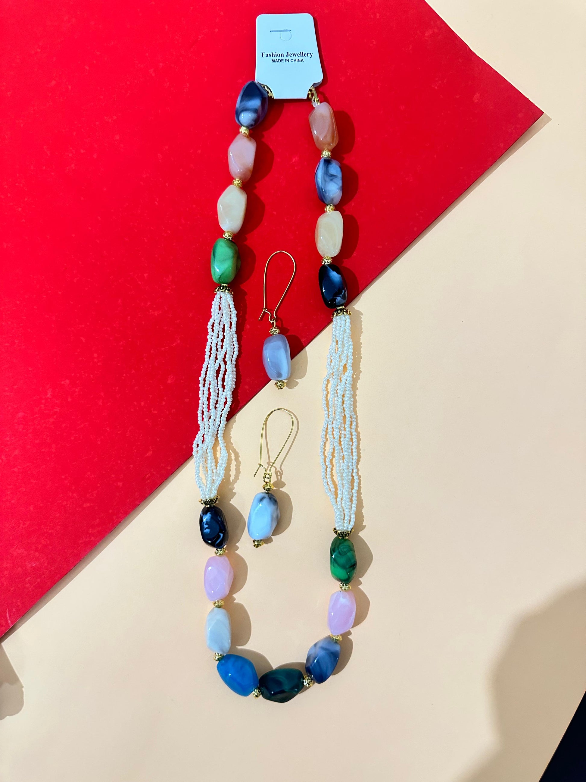 Infuse your look with playful charm and natural beauty with our Multicolor Pebble Bead Necklace Set. This eye-catching long necklace features an array of smooth, irregular pebble-shaped beads in a delightful mix of vibrant colors, including pink, green, blue, and cream. Delicate white seed bead tassels add a whimsical touch to each end, leading to a golden clasp. The accompanying drop earrings echo the necklace's joyful palette with a single colored pebble bead. Perfect for adding a bohemian flair and lively splash of color to your everyday style.