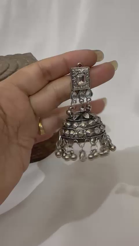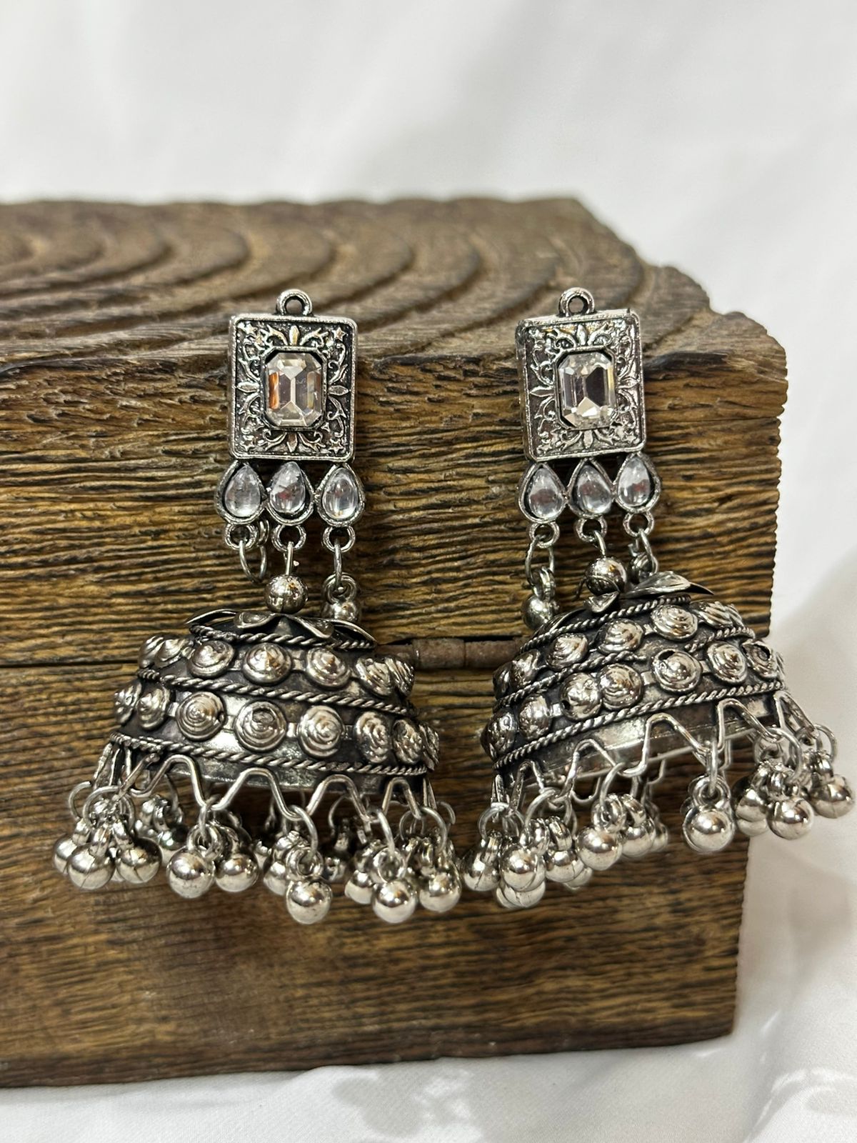 Add a timeless touch to your look with these oxidized square-top Jhumkas. Intricate carvings and ghungroo drops make them the perfect pick for everyday elegance or festive wear.