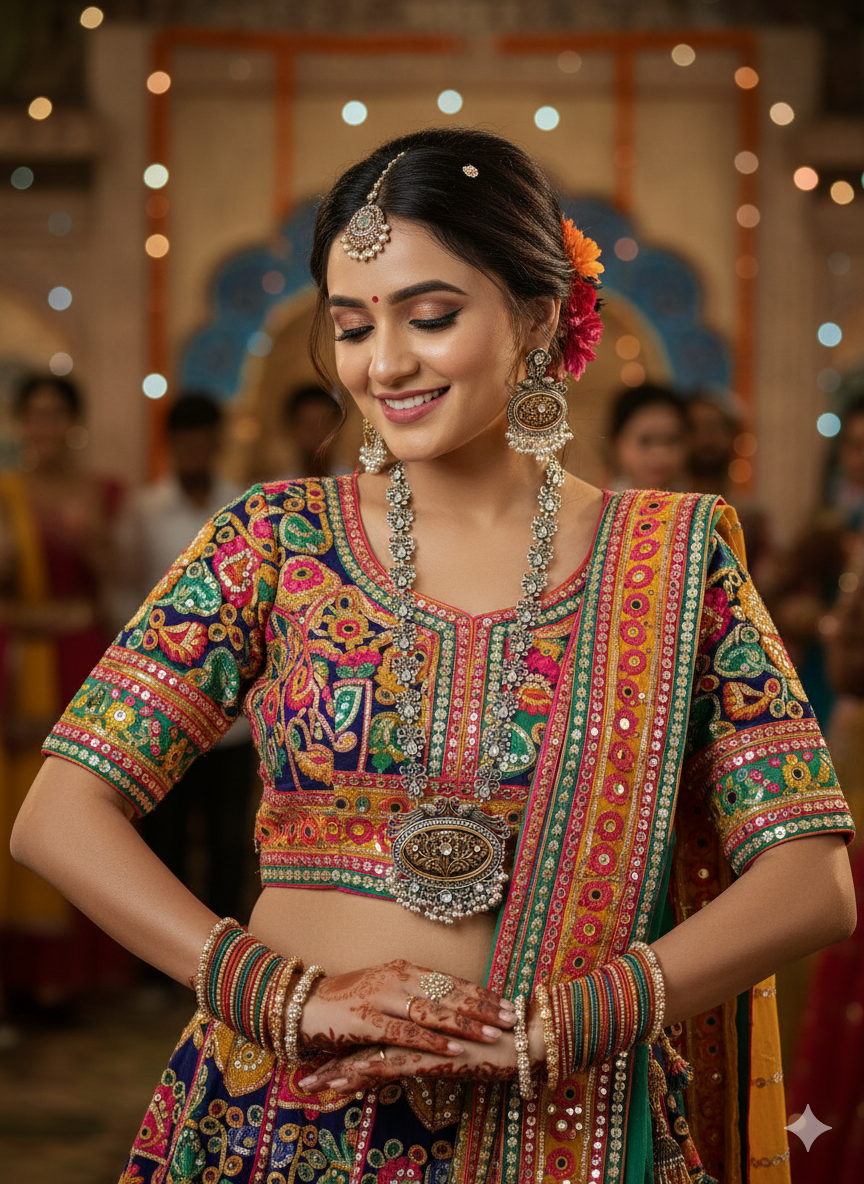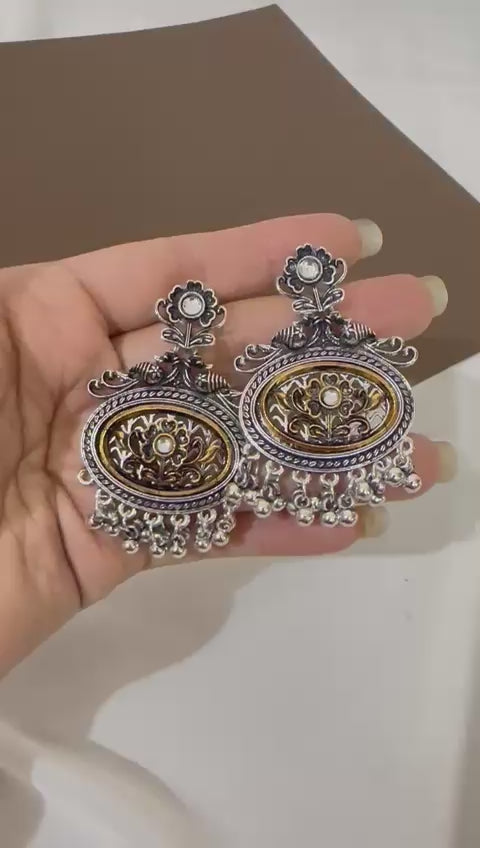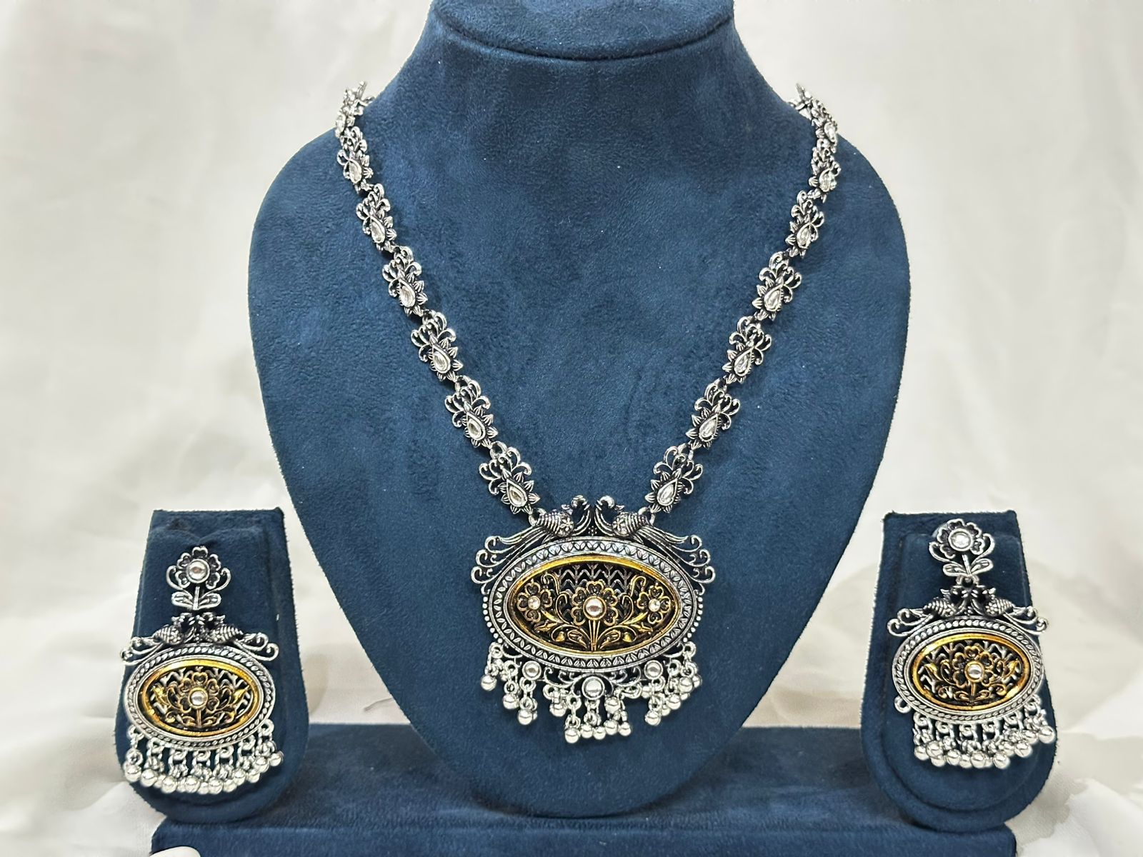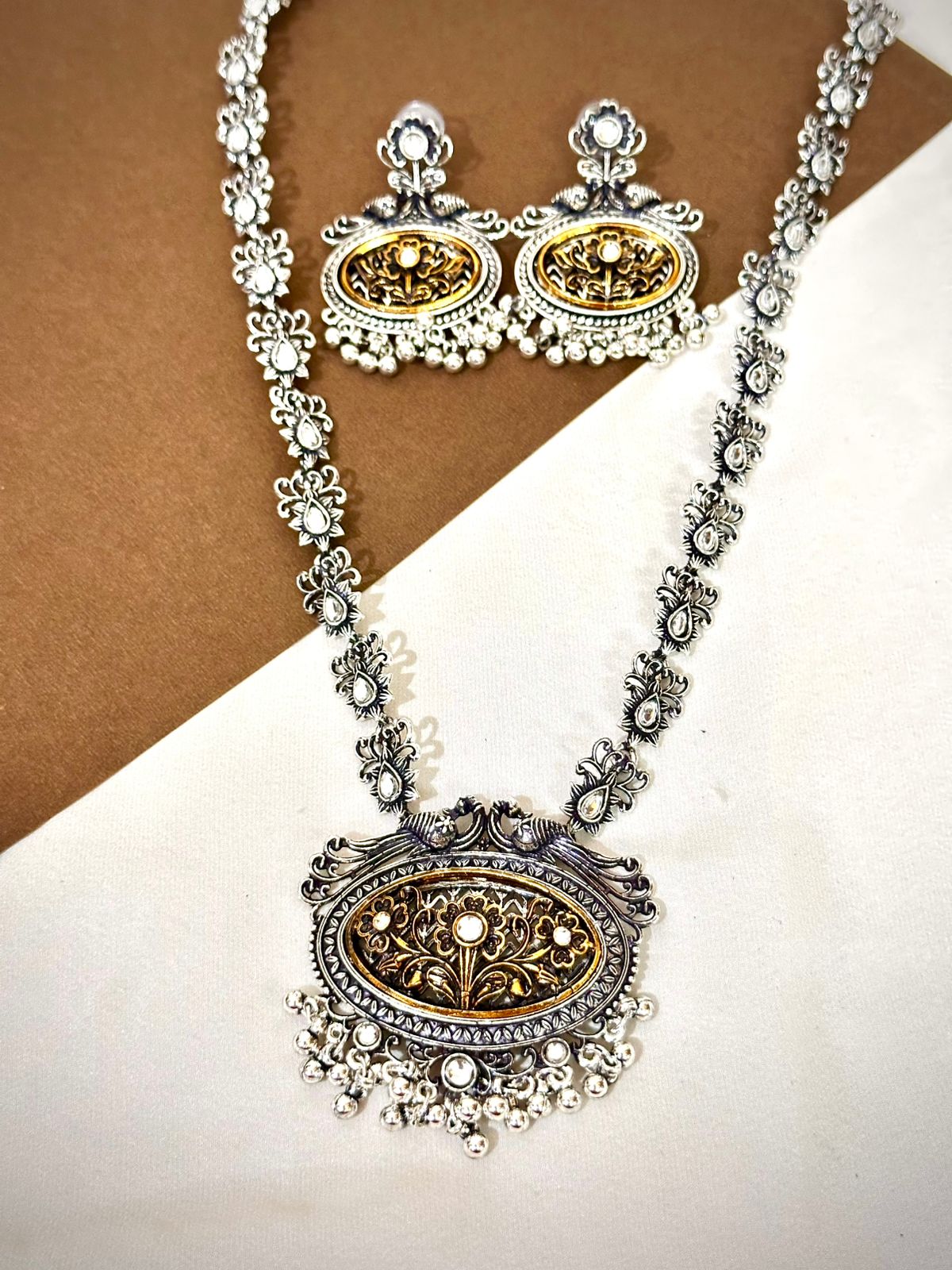 Adorn yourself with this striking dual-tone necklace set that beautifully blends classic and contemporary styles. The long oxidized silver chain, with its delicate floral links, leads down to a large oval pendant with intricate gold-plated work and a dangling fringe of ghungroo beads. The matching earrings perfectly echo the design, making this a bold and elegant set for any occasion.