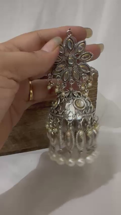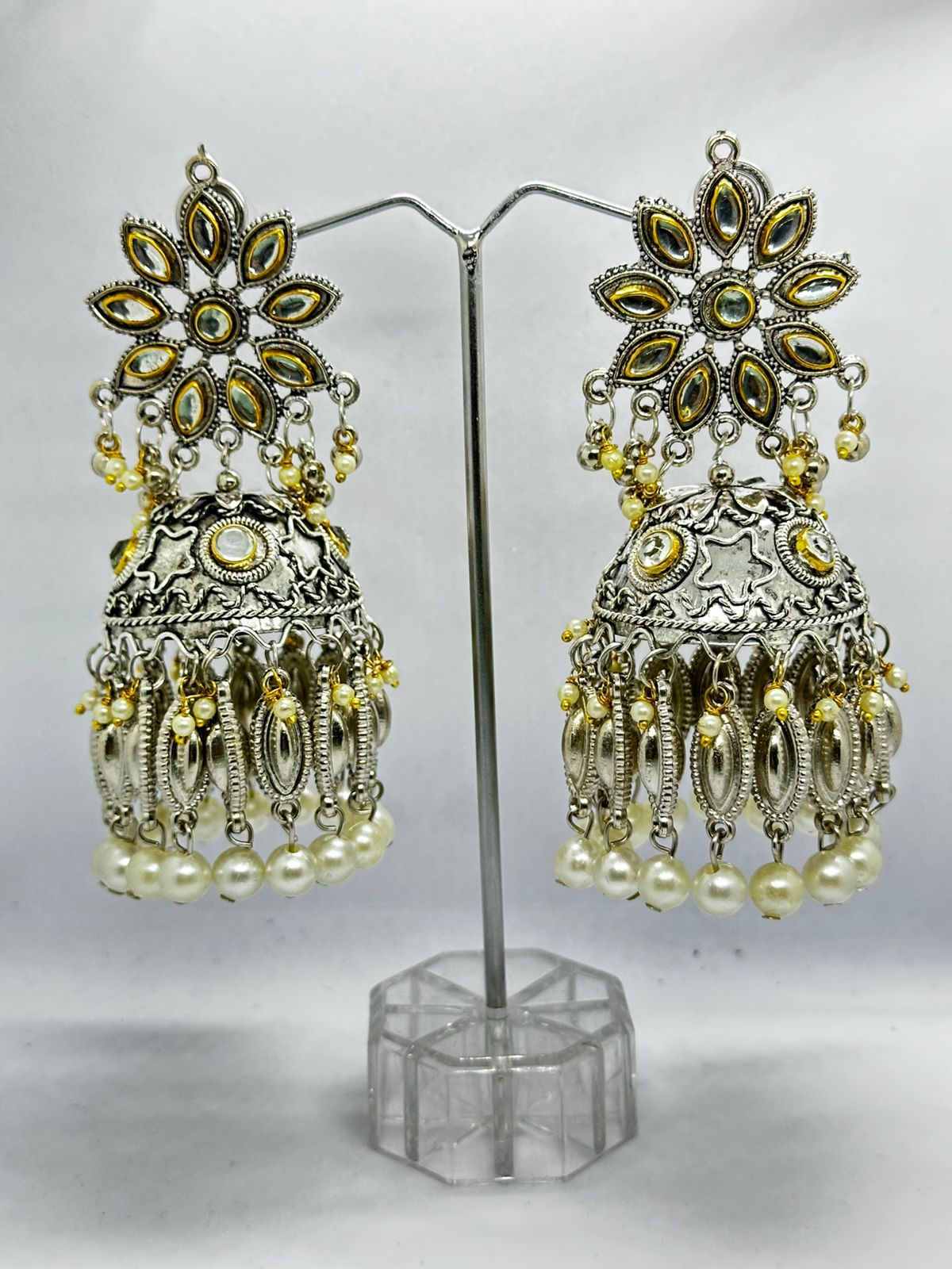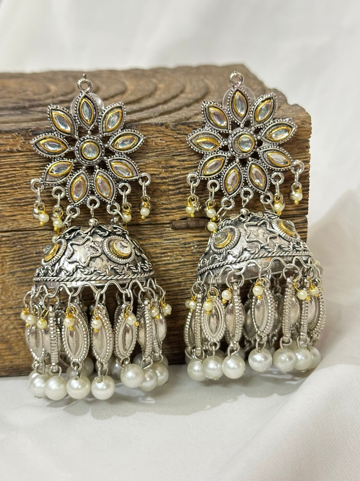 A blend of tradition and grace – these floral-inspired Jhumkas are adorned with pearls and golden detailing, giving your ethnic look a royal charm. Lightweight and festive-ready!