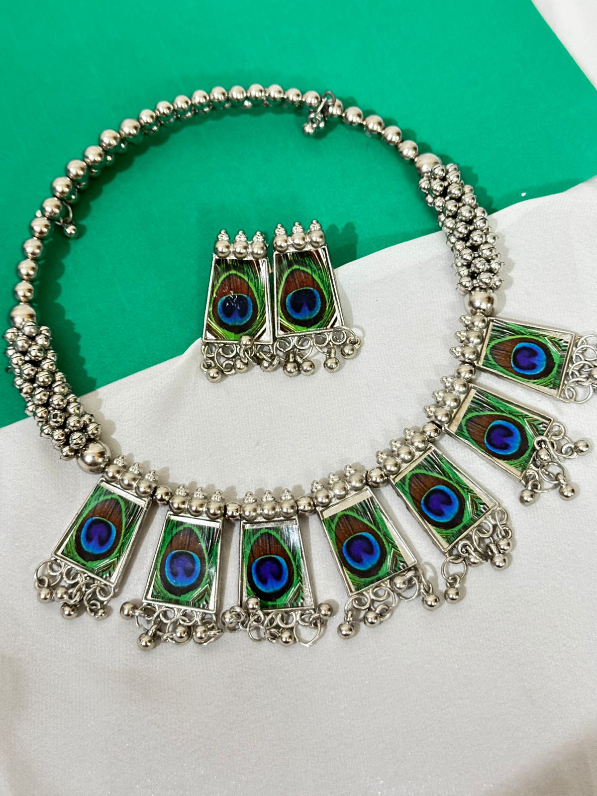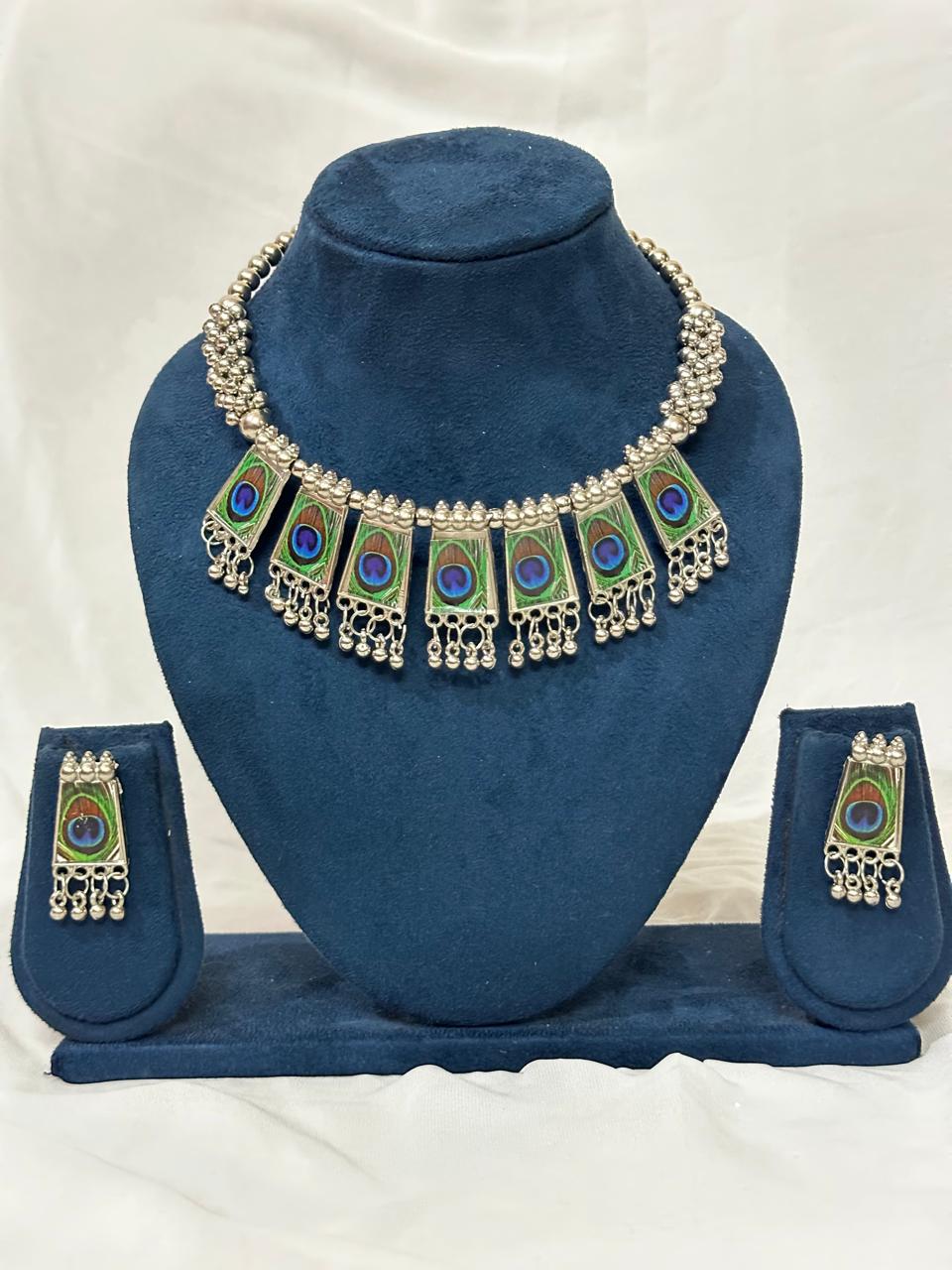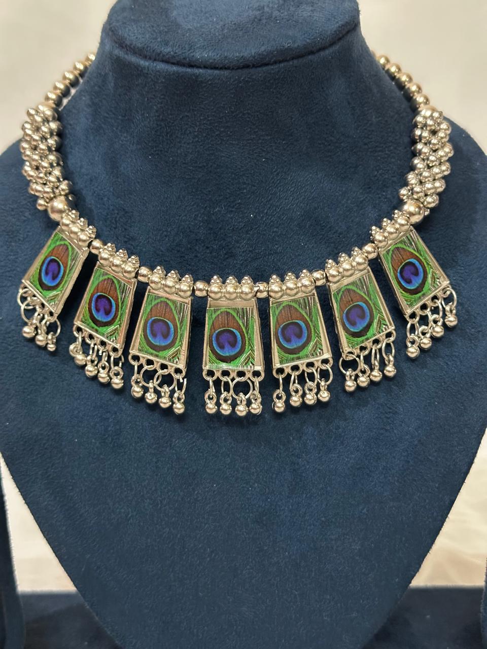Adorn yourself with this unique and artistic oxidized silver necklace set, a tribute to the beauty of the peacock. The choker-style necklace features a series of intricately designed pendants with vibrant enamel work that mimics the natural eye of a peacock feather. The matching earrings complete this one-of-a-kind set, making it a perfect statement piece for adding a touch of bold elegance to your ethnic or contemporary outfits.