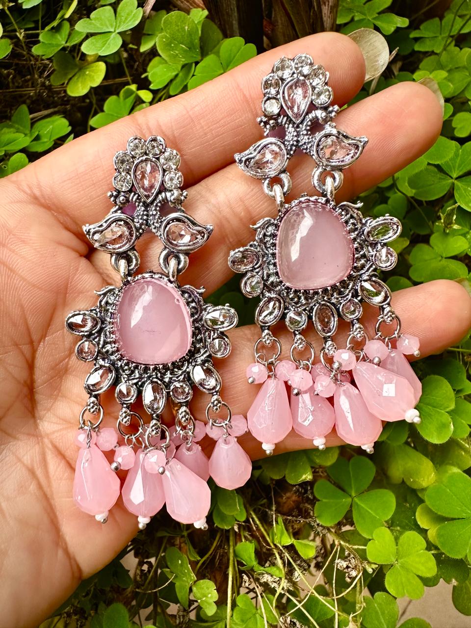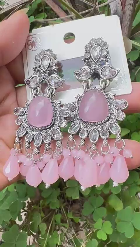 Add a touch of soft elegance to your jewelry collection with these beautiful oxidized silver earrings. The intricate floral stud is adorned with shimmering pink and white stones, leading to a stunning drop featuring a large baby pink stone and a fringe of matching dangling beads. These earrings are perfect for adding a subtle pop of color and graceful movement to any ethnic or contemporary outfit.