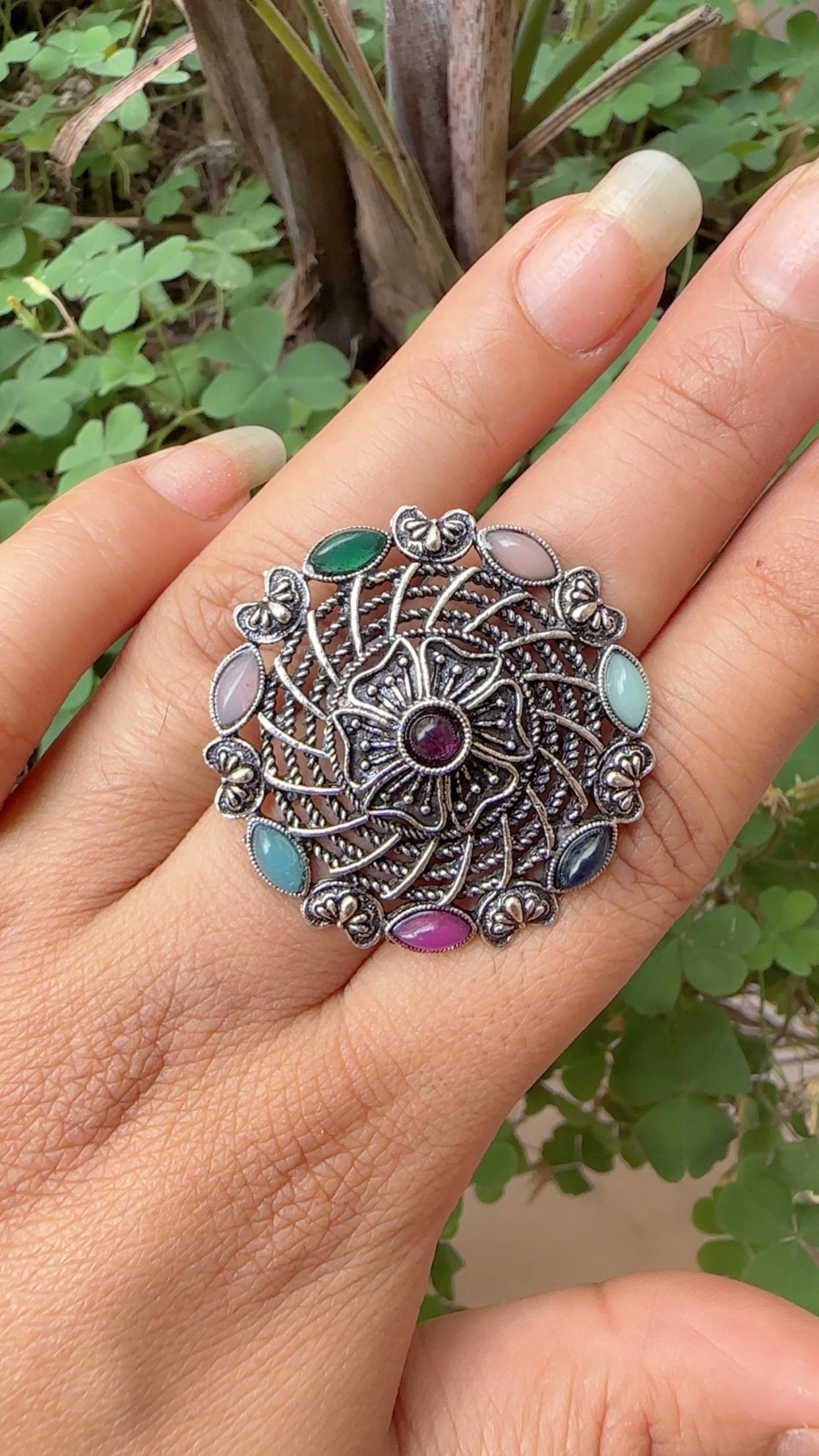This adjustable oxidized silver ring features a large, striking floral design. The center is adorned with a soft pink stone, while the petals are lined with a variety of colorful stones in shades of green, red, pink, and blue. This bold and artistic ring is perfect for adding a bohemian flair to your style.