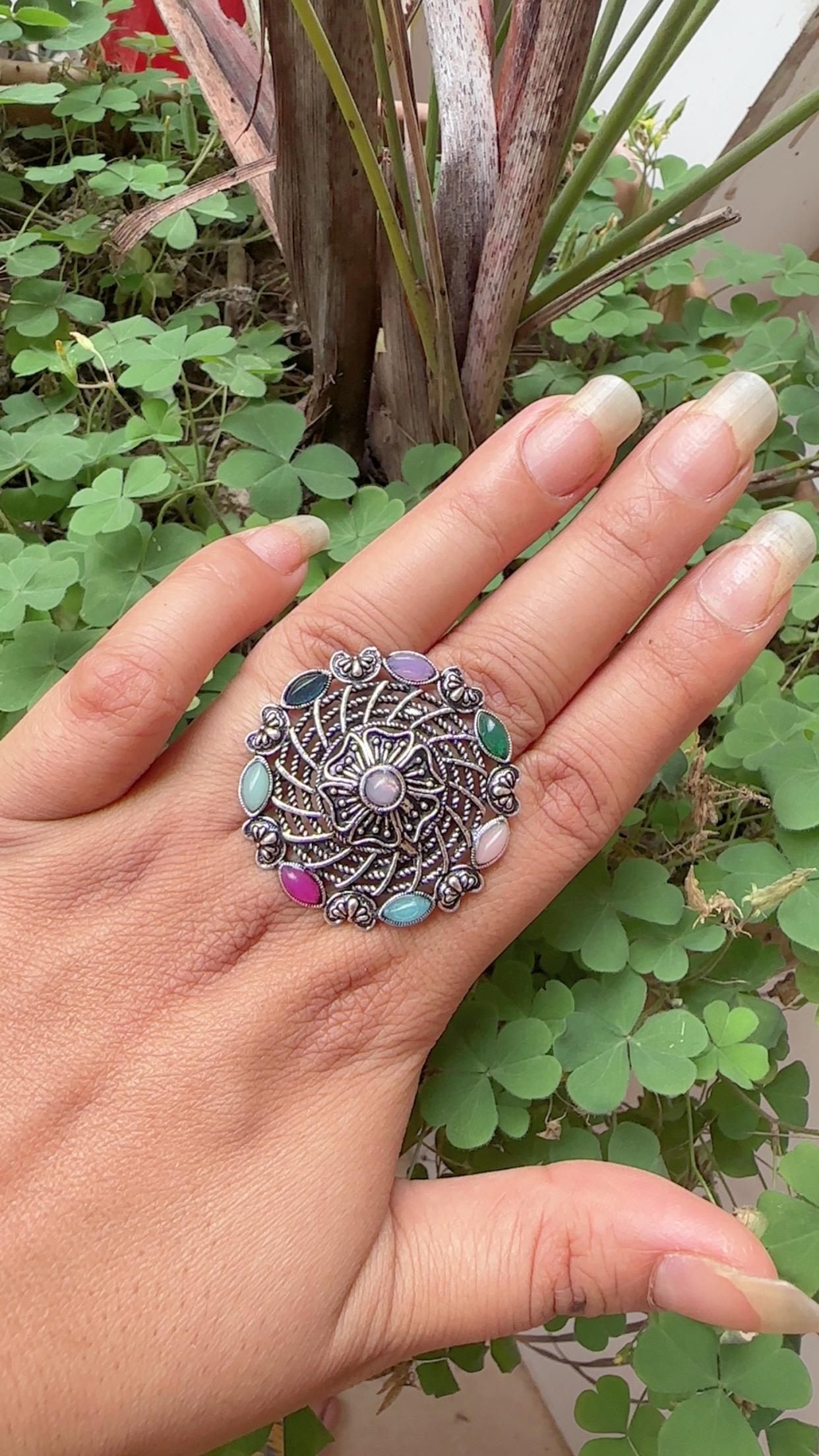 This beautiful oxidized silver ring features a central flower motif with a light-colored stone and a surrounding frame of colorful stone petals. The intricate detailing and a mix of vibrant and pastel stones make this a perfect accessory for adding a touch of rustic charm and color to your look.