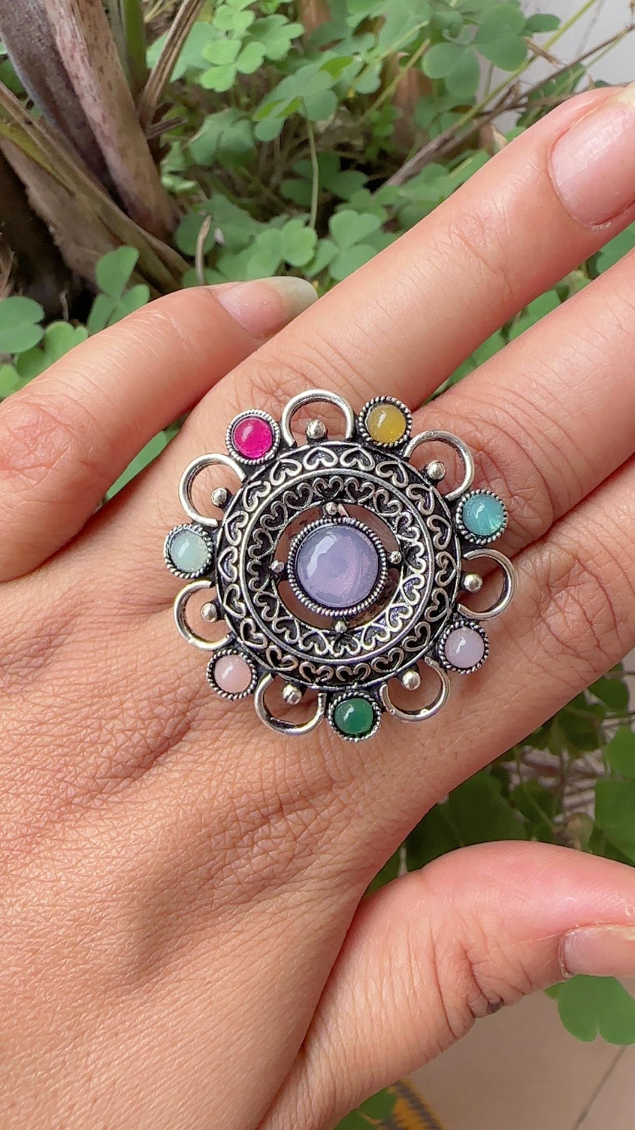 This adjustable oxidized silver ring features a large, striking floral design. The center is adorned with a soft pink stone, while the petals are lined with a variety of colorful stones in shades of green, red, pink, and blue. This bold and artistic ring is perfect for adding a bohemian flair to your style.