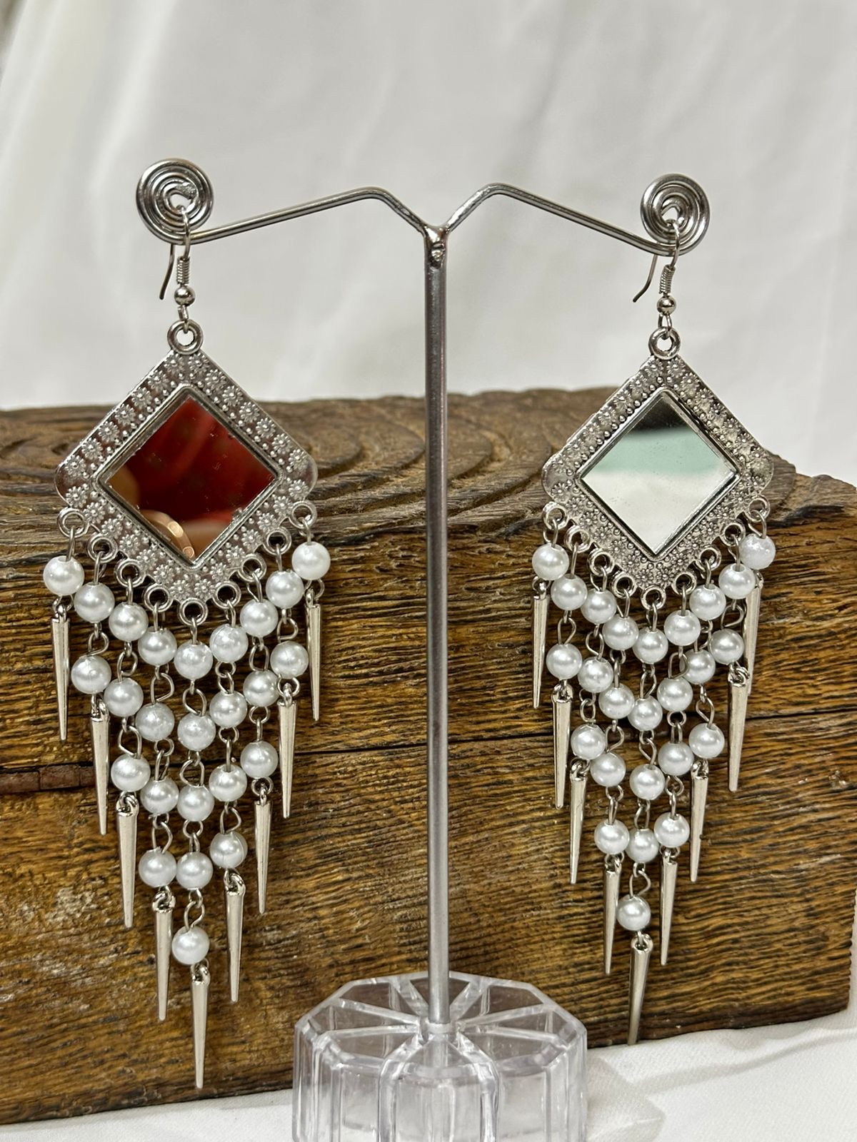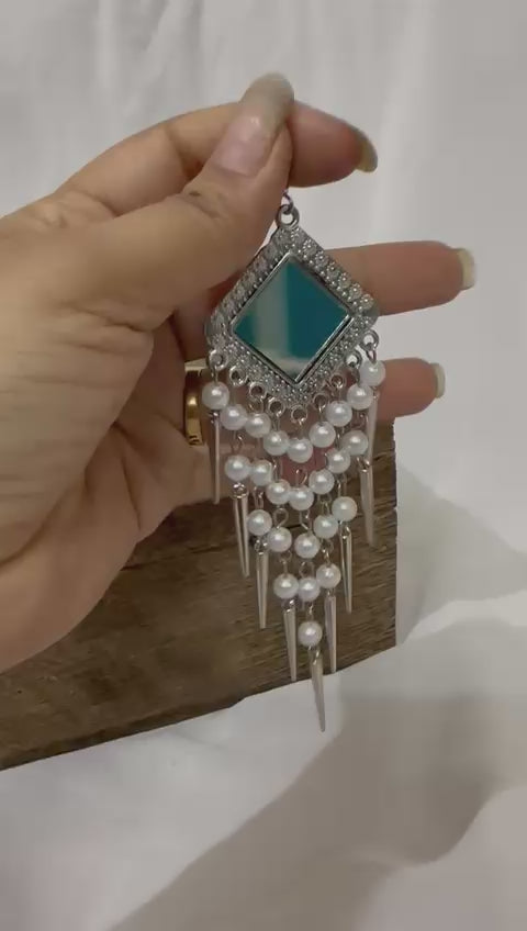 Make a bold statement with these unique oxidized silver earrings. The large, diamond-shaped stud features a mirror at its center, surrounded by a border of sparkling white pearls and striking silver spikes. These earrings perfectly blend traditional elements with a modern, edgy design, making them a standout accessory.