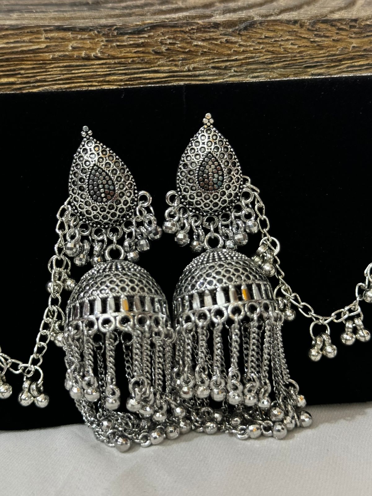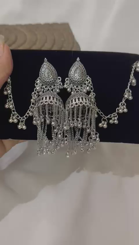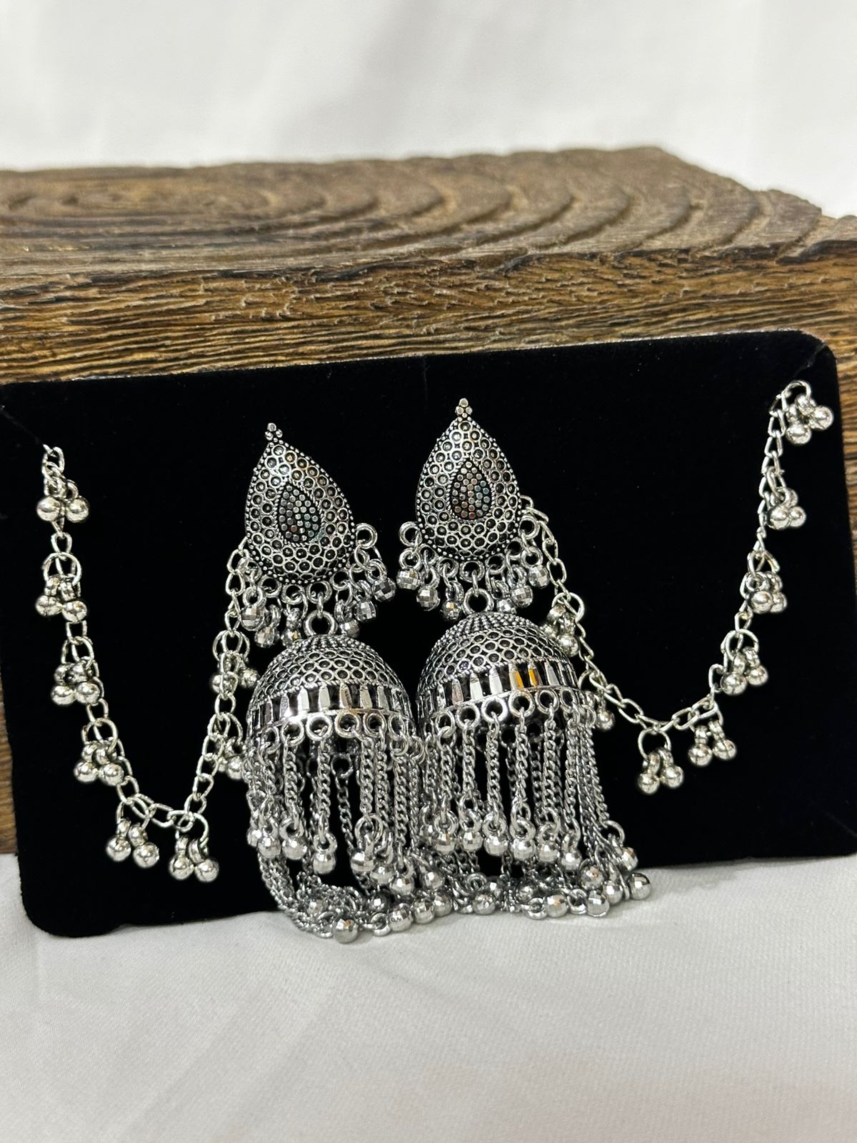 This statement-making set features classic oxidized silver jhumka earrings with a unique twist. The central stud is connected to a beautifully detailed jhumka bell, which is then linked to a stylish ear chain adorned with delicate ghungroo beads. This piece effortlessly blends traditional style with a modern, edgy design, making it a perfect accessory for any contemporary ethnic look.