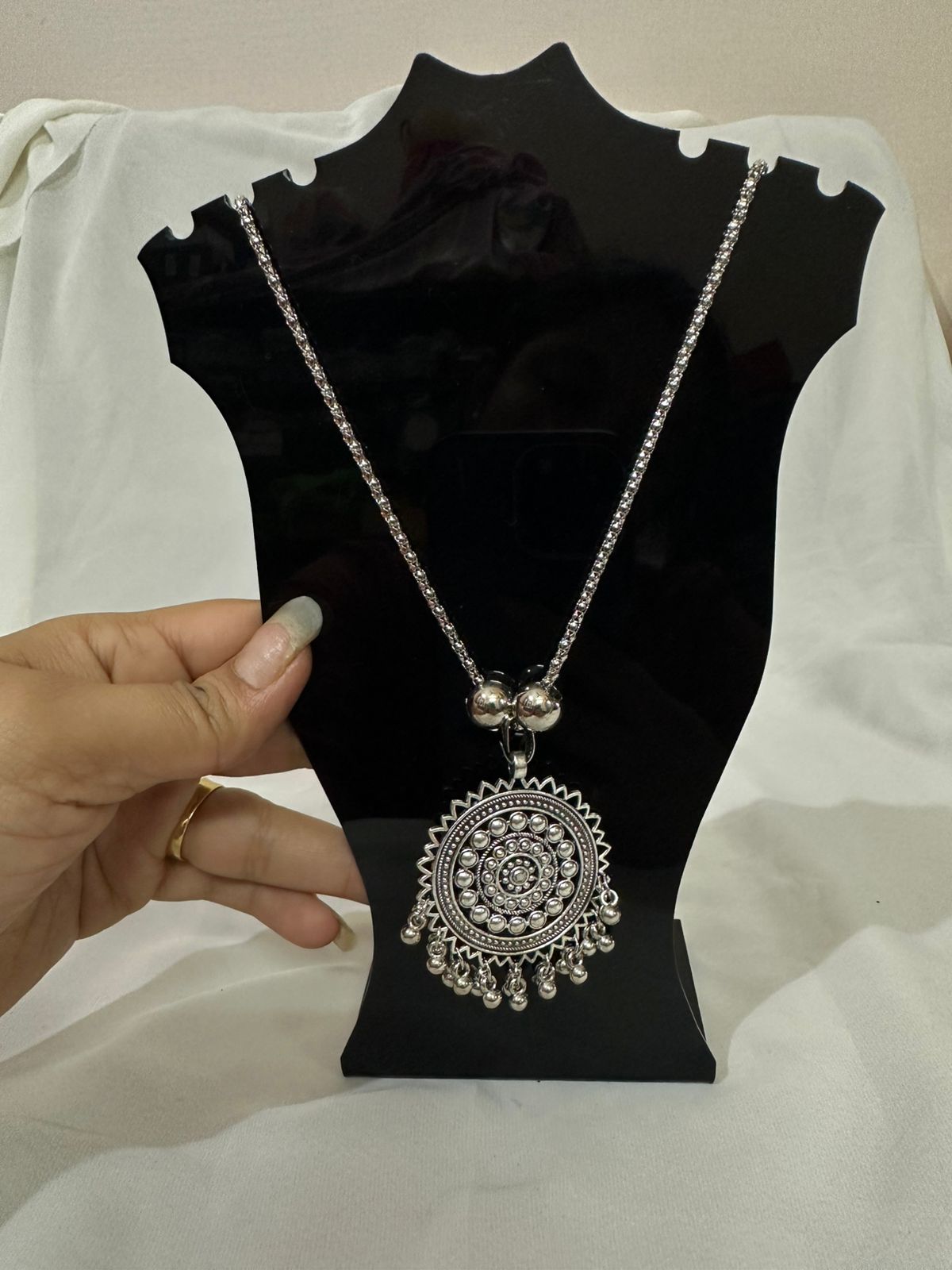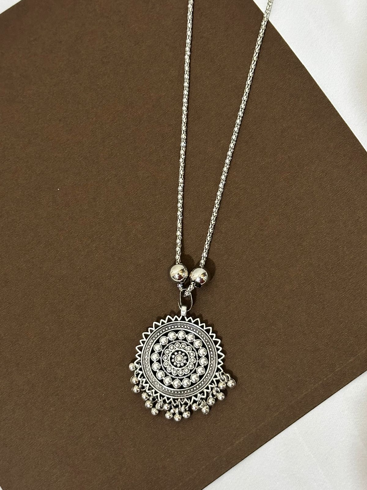 Adorn yourself with this beautiful long necklace, featuring a striking oxidized silver pendant with an intricate mandala-inspired design. The detailed pattern and small hanging ghungroos add a touch of traditional artistry, while the smooth, long chain provides a modern, versatile look. This piece is perfect for making a stylish statement with any ethnic or contemporary outfit.