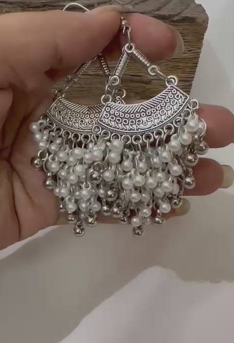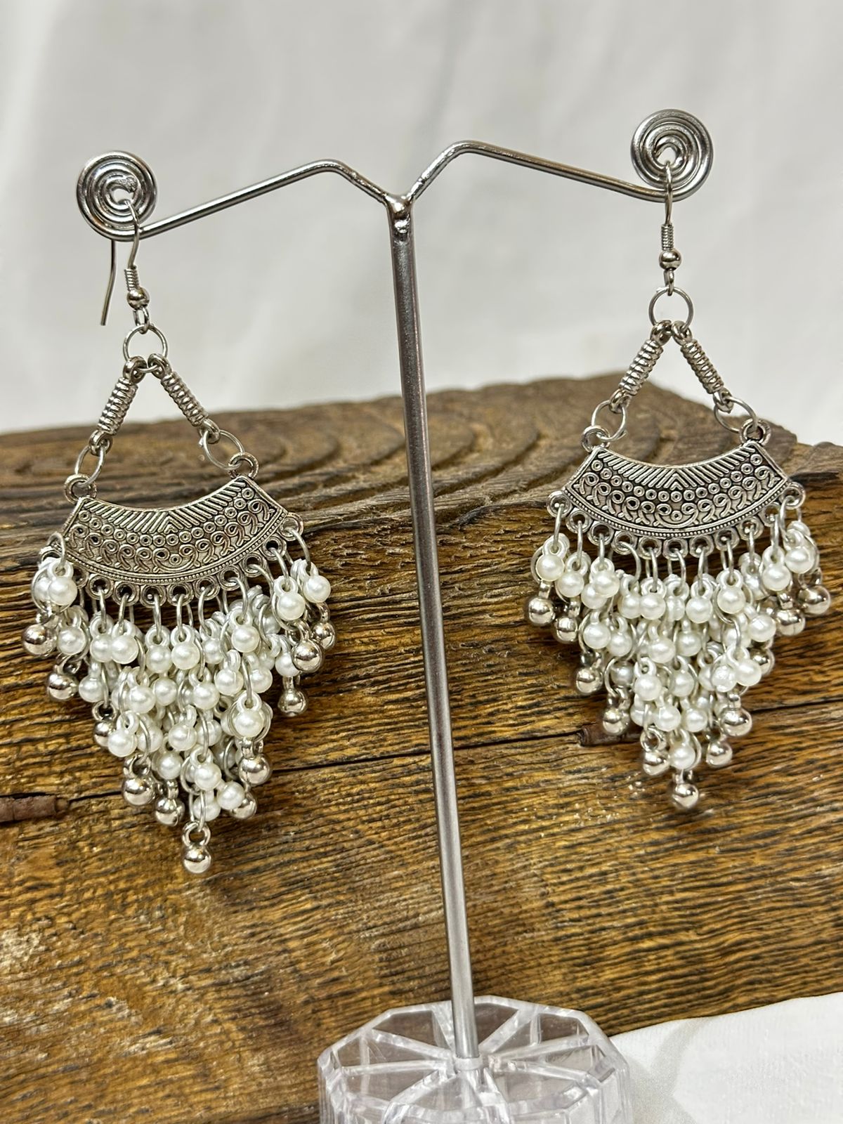 This pair of oxidized silver earrings features a beautifully crafted fan-shaped design. The intricate detailing on the silver is complemented by a delicate fringe of white pearls, creating a classic and graceful look. These versatile earrings are perfect for adding a touch of traditional elegance to any outfit.