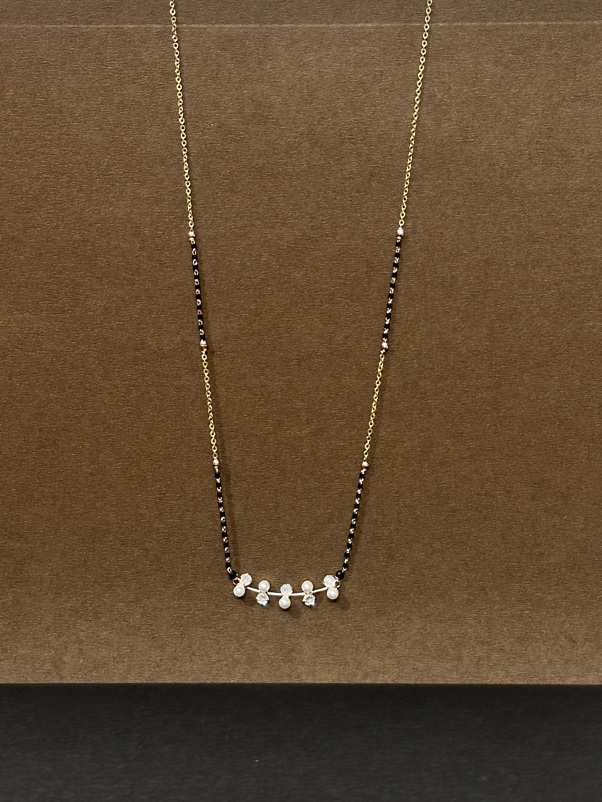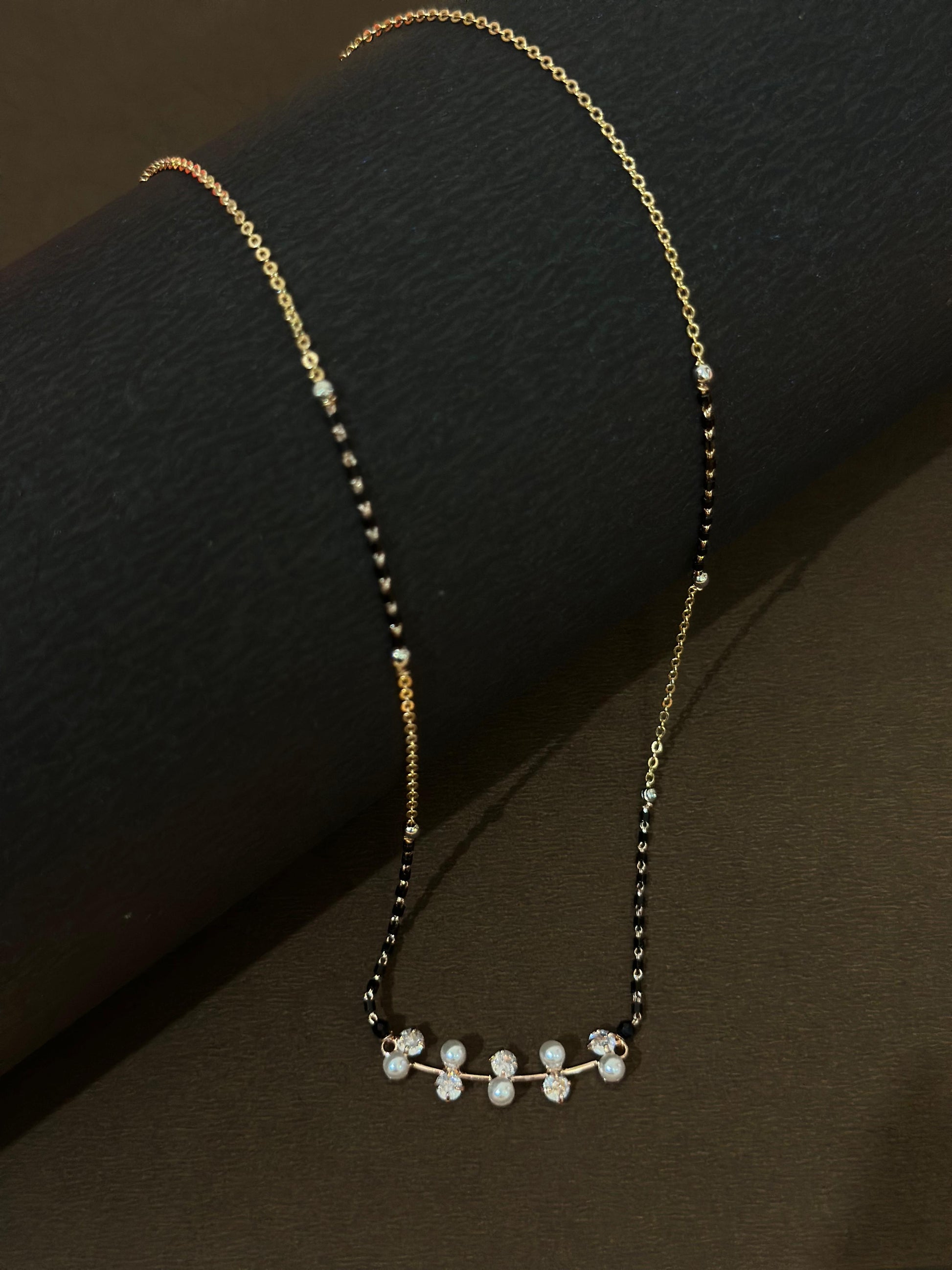 Discover delicate elegance with our Pearl & Crystal Harmony Mangalsutra. This graceful short-length necklace features a classic gold-toned chain interspersed with traditional black beads. The centerpiece showcases a beautiful arrangement of lustrous pearls nestled between sparkling American Diamonds, creating a harmonious and understated design. Ideal for daily wear, it offers a blend of classic charm and subtle brilliance.