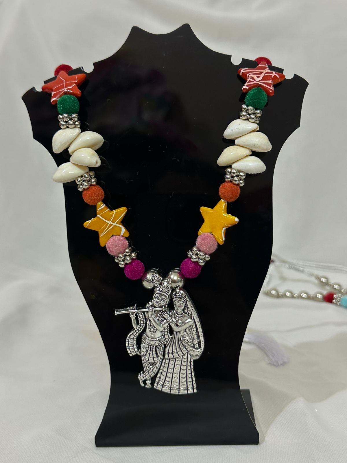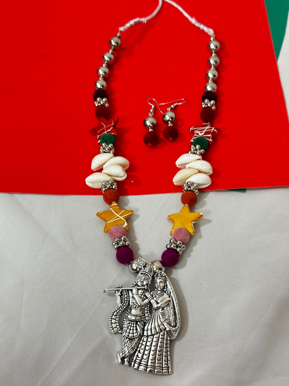 Adorn yourself with this unique necklace featuring a beautiful oxidized silver pendant of Radha and Krishna. The necklace is strung with a striking combination of traditional oxidized bell beads and vibrant, colorful stones in shades of red, blue, and purple. The matching earrings complete this elegant and spiritual look, making it a perfect statement piece for any occasion.