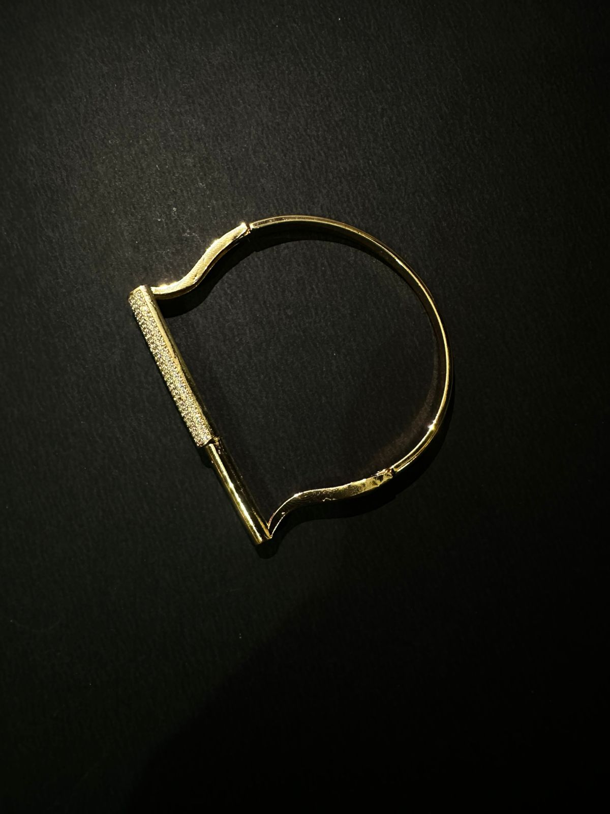Make a bold and brilliant statement with our Radiant Pave Bar Cuff Bangle. This striking gold-toned bangle features a sleek, contemporary design where a significant portion is completely encrusted with shimmering pave-set crystals. The continuous line of dazzling crystals contrasts beautifully with the smooth, polished gold-toned band, creating an elegant U-shaped silhouette that comfortably wraps around your wrist. Perfect for adding a touch of modern luxury and effortless sparkle to any ensemble, this versatile piece is ideal for both standalone wear and stacking.