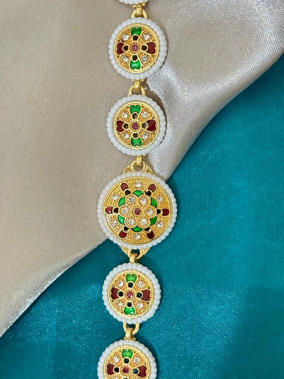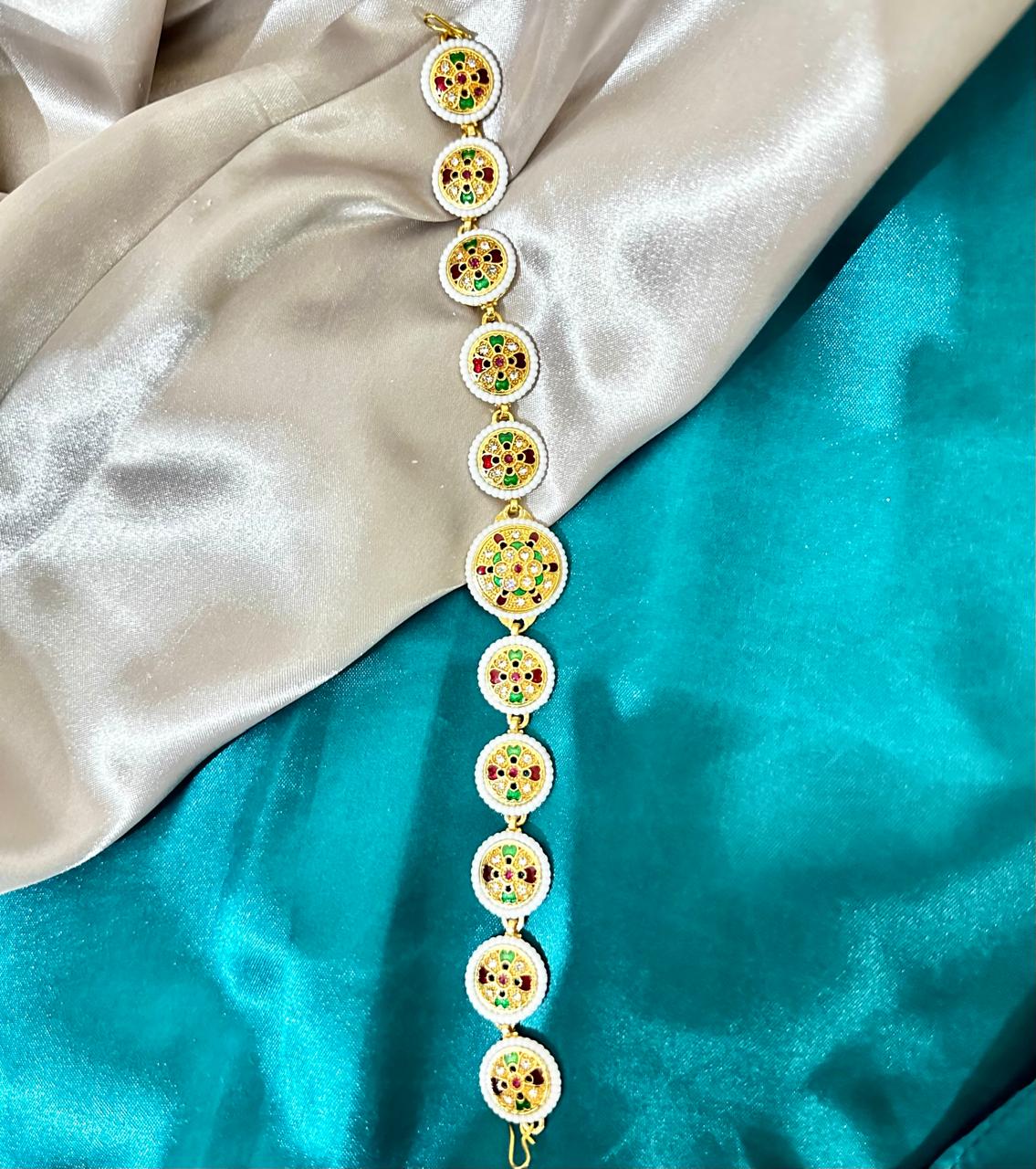 Adorn yourself with this exquisite Rajwadi-style Matha Patti, a perfect blend of tradition and elegance. The piece features a series of intricate, gold-plated floral discs, each centered with vibrant green and red stones and surrounded by delicate pearls. This stunning headpiece is designed to beautifully frame your hairline, adding a regal and grand touch to your bridal or festive look.