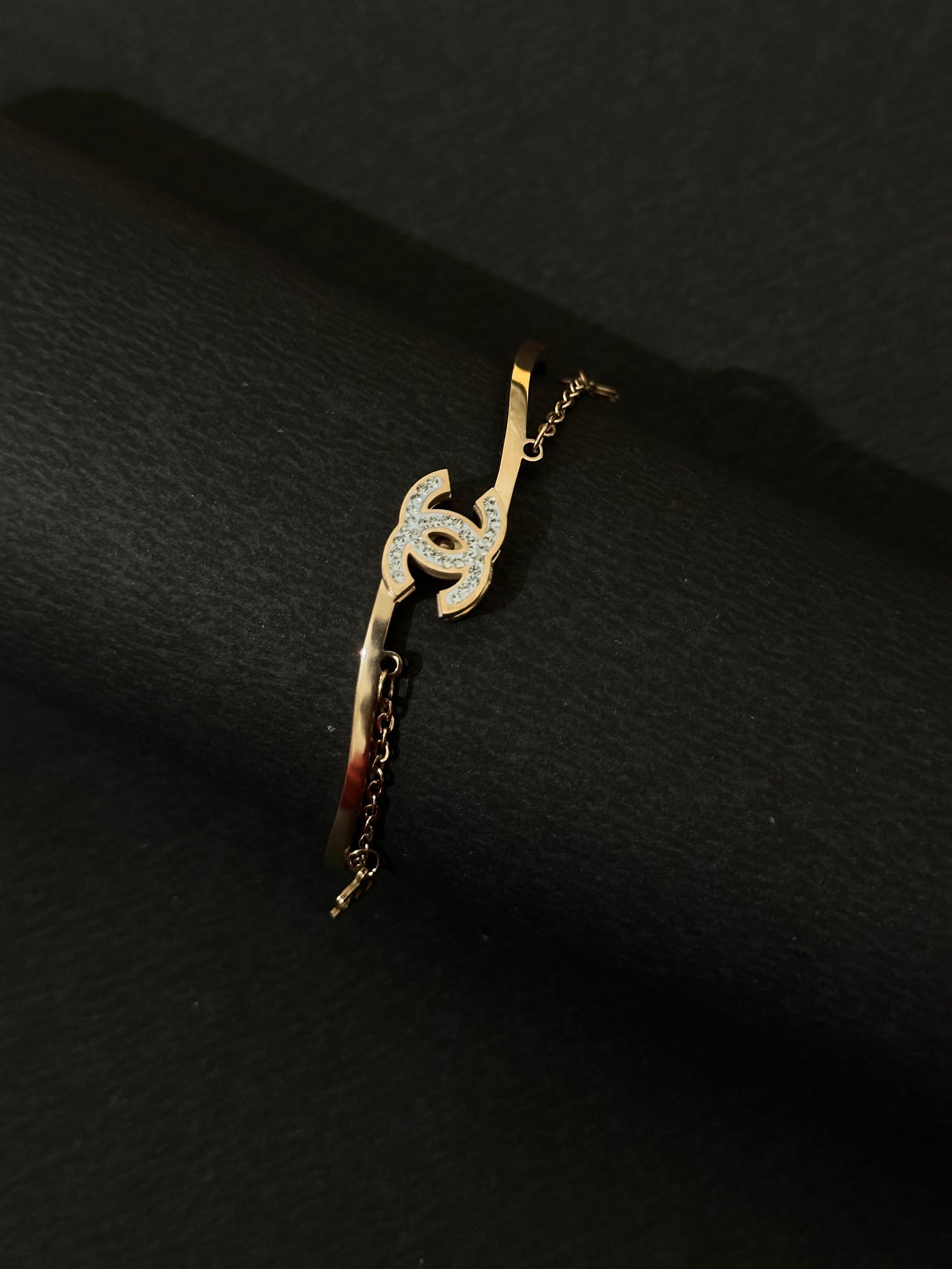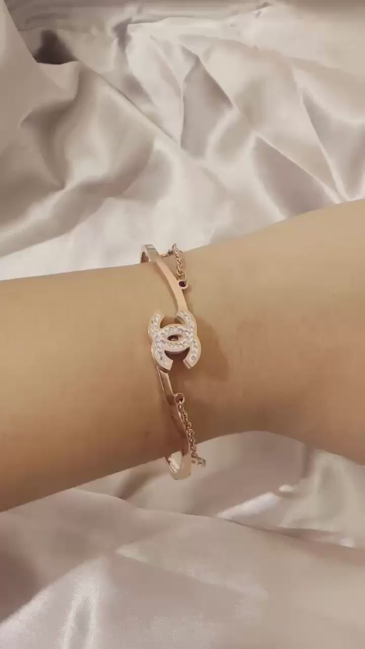 Add a touch of iconic sophistication to your wrist with our Rose Gold & Crystal Interlocking Charm Bracelet. This elegant piece features a delicate rose gold-toned chain leading to a sleek band that gracefully holds a shimmering, crystal-encrusted interlocking motif. The adjustable chain ensures a perfect fit, making it an ideal accessory for both everyday chic and special occasions, subtly hinting at high-fashion inspiration.