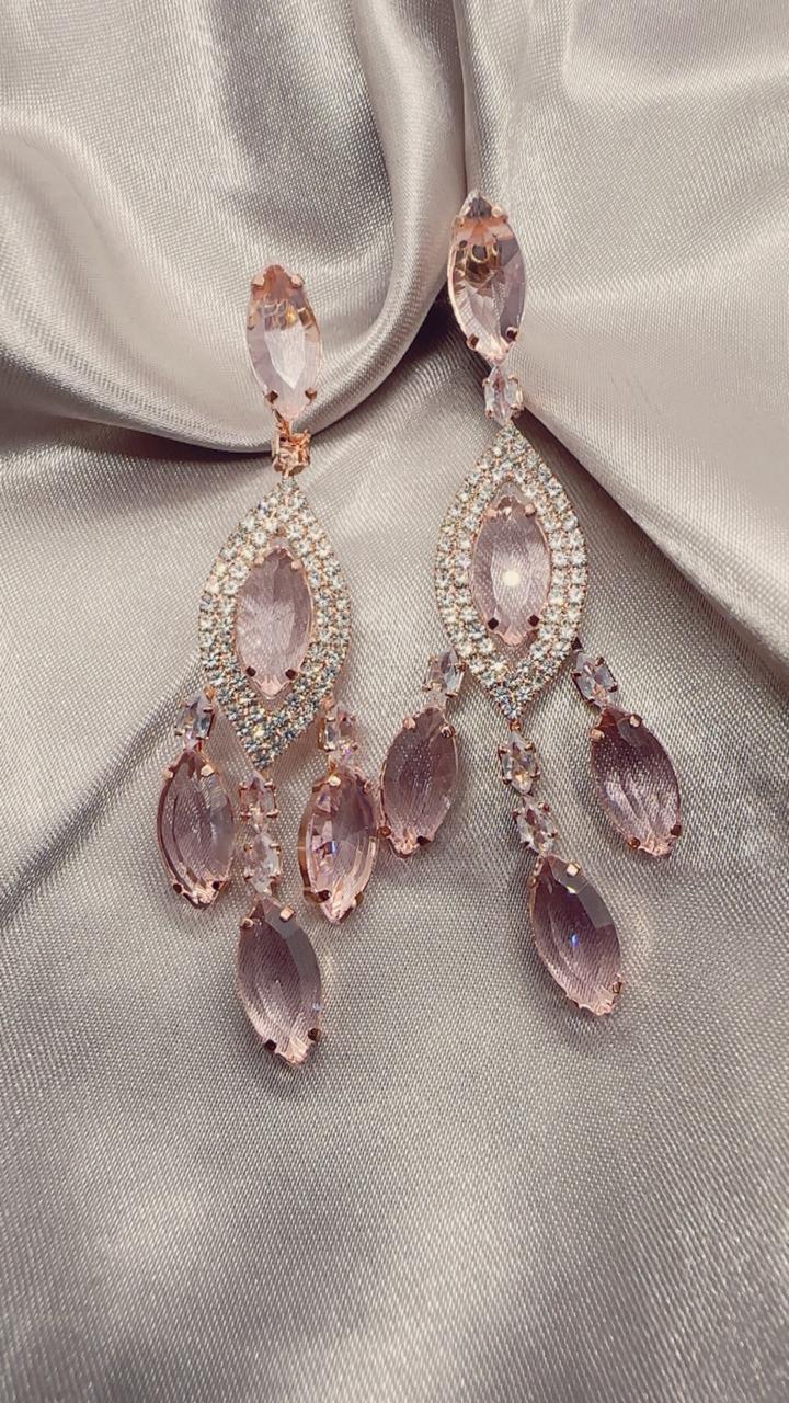 Dazzle with delicate grace in our Rose Quartz Radiance Chandelier Earrings. These exquisite rose gold-toned earrings feature a captivating cascade of shimmering pink-hued crystals. Each earring showcases a marquise-cut crystal top, leading to a larger, eye-shaped centerpiece encrusted with brilliant pave-set stones. Five additional teardrop-shaped pink crystals gracefully dangle below, creating a mesmerizing sparkle with every movement. Perfect for adding a touch of romantic glamour to weddings, evening events, or any occasion where you want to shine.