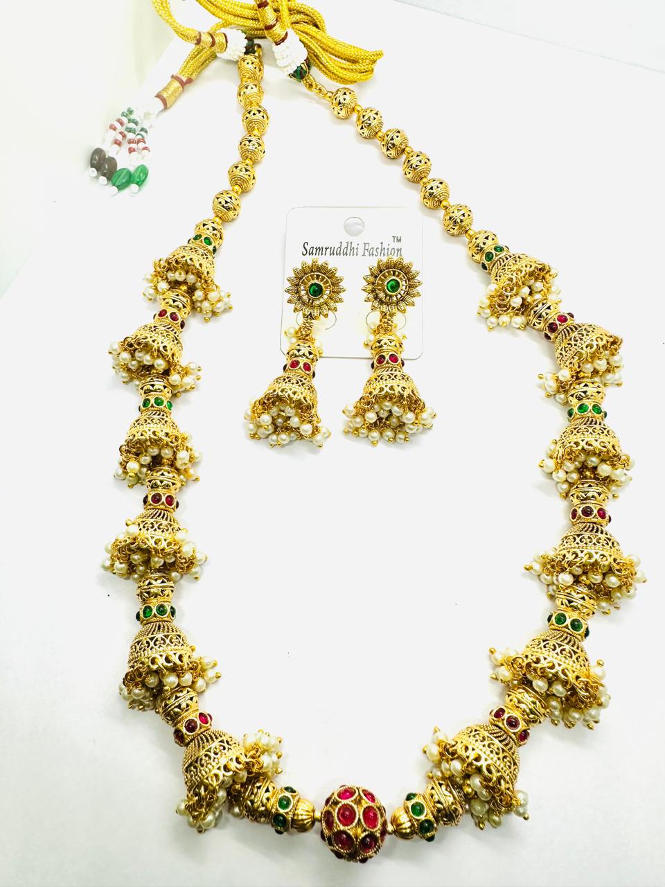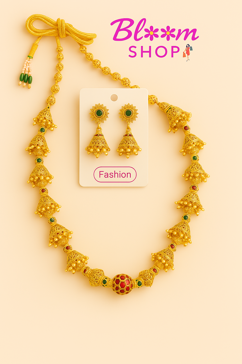 Step into timeless tradition with our Royal Temple Jhumka Necklace Set, inspired by the grandeur of South Indian temple jewelry. Intricately designed with golden filigree work, the necklace features multiple bell-shaped jhumka motifs adorned with ruby red and emerald green accents, finished with delicate pearl detailing. Paired with matching jhumka earrings, this set is perfect for weddings, festivals, or classical events where elegance meets culture. An exquisite piece that celebrates heritage and makes a bold statement.