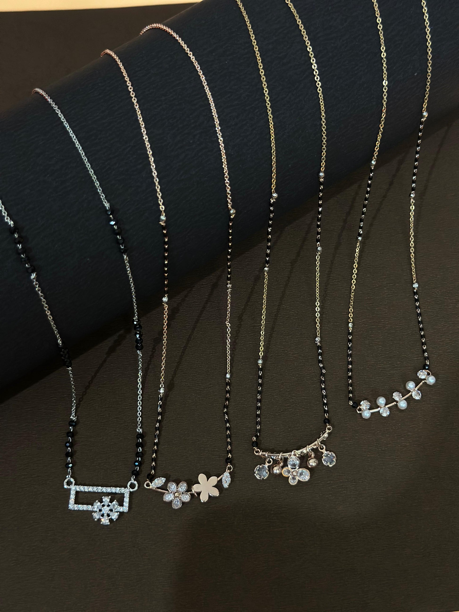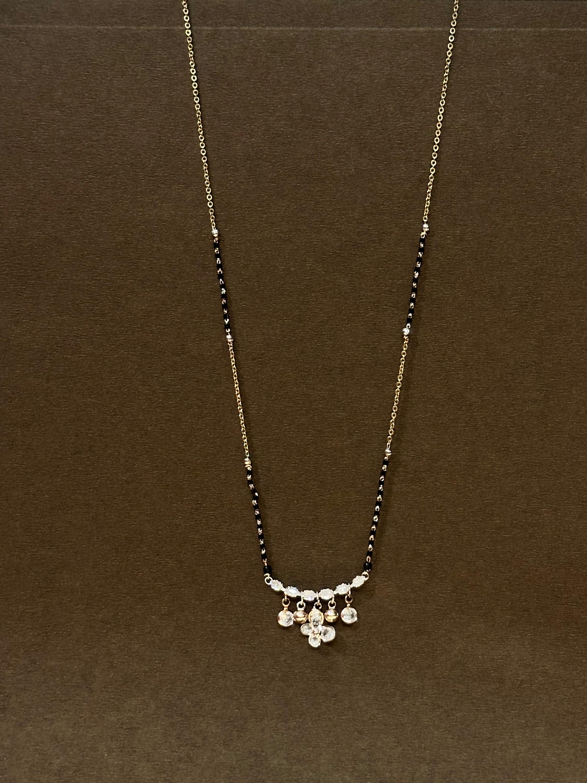 Adorn your neckline with our refined Sparkling AD Cascade Mangalsutra. This delicate short-length necklace combines a classic gold-toned chain with traditional black beads. The elegant centerpiece features a graceful curved bar set with shimmering American Diamonds, from which a dazzling array of round and pear-shaped AD drops gracefully cascade. It's a perfect blend of subtle glamour and cultural significance for everyday wear.