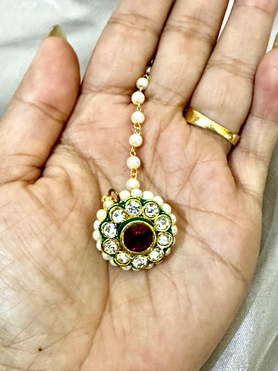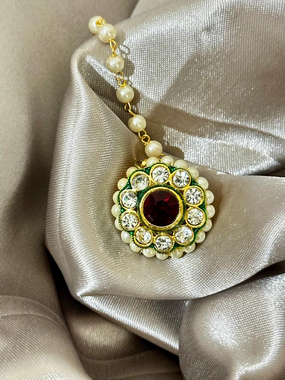 Complete your traditional look with this exquisite gold-plated Maang Tikka. The circular pendant features a vibrant red stone at its center, encircled by sparkling white Kundan stones and a delicate border of white pearls. A simple, elegant pearl chain connects the pendant, making this piece a perfect accessory for any festive occasion or bridal ensemble. It's a beautiful way to add a touch of grace and classic style.