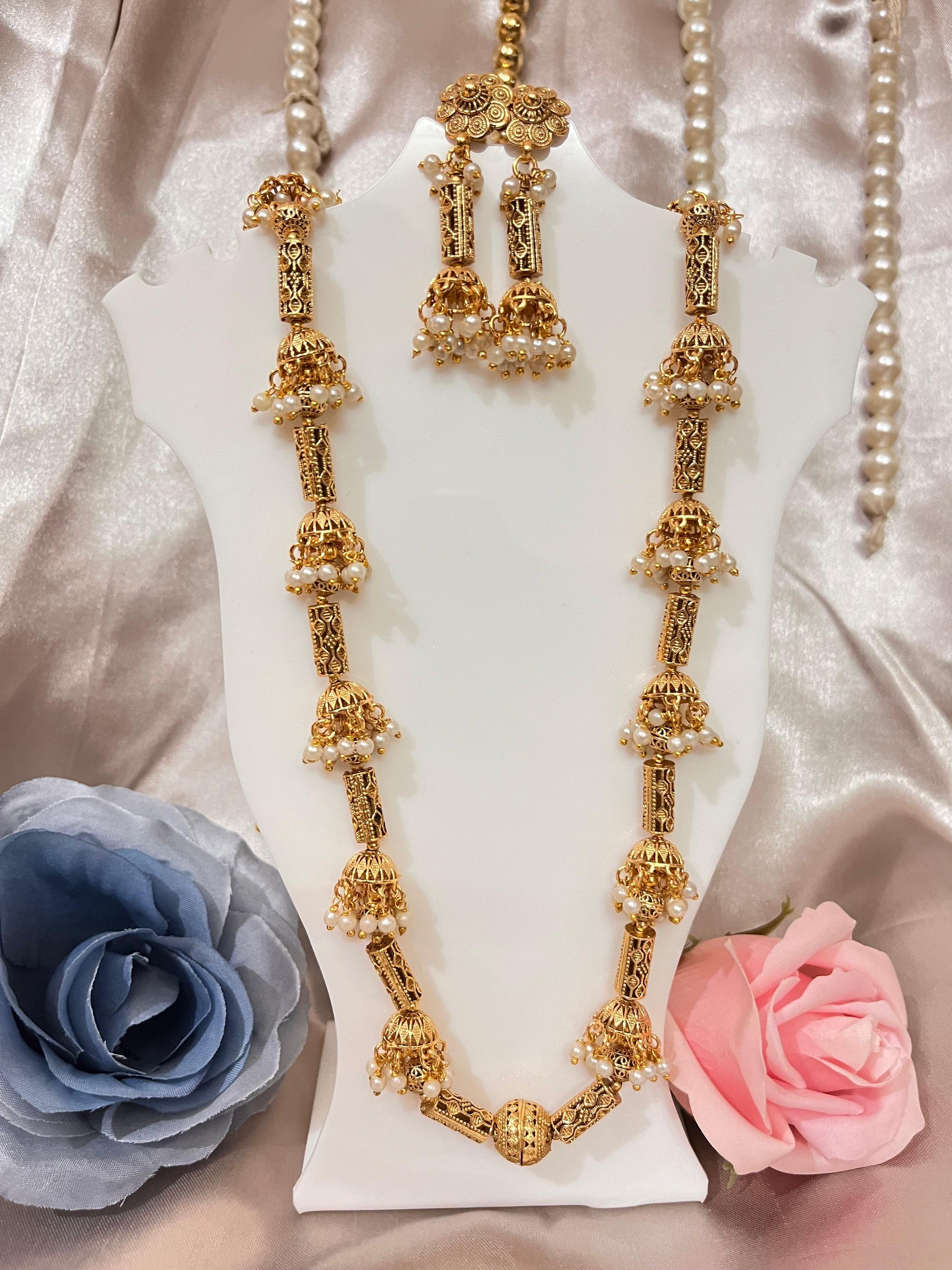 Adorn yourself with this elegant gold-plated necklace set, a tribute to timeless traditional Indian jewelry. This long necklace features a series of beautifully crafted jhumka bells and intricate golden beads, each accented with delicate pearl drops. Paired with matching jhumka earrings, this set is perfect for adding a touch of classic sophistication to any festive or wedding outfit.