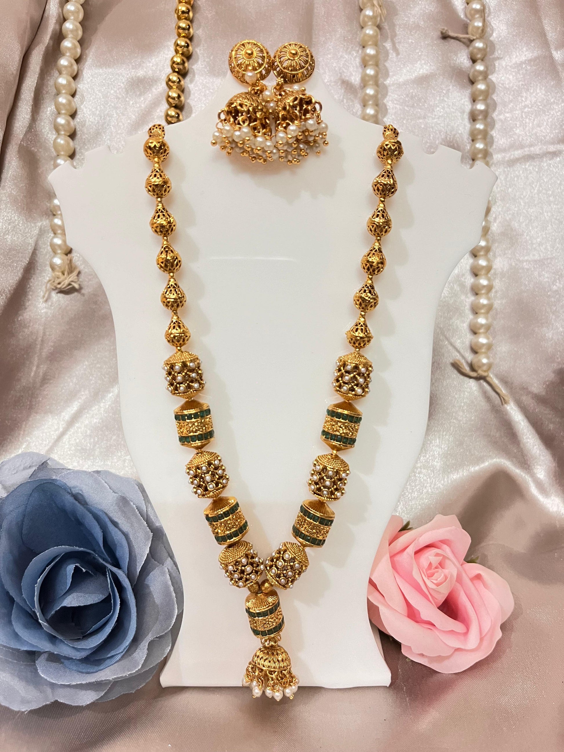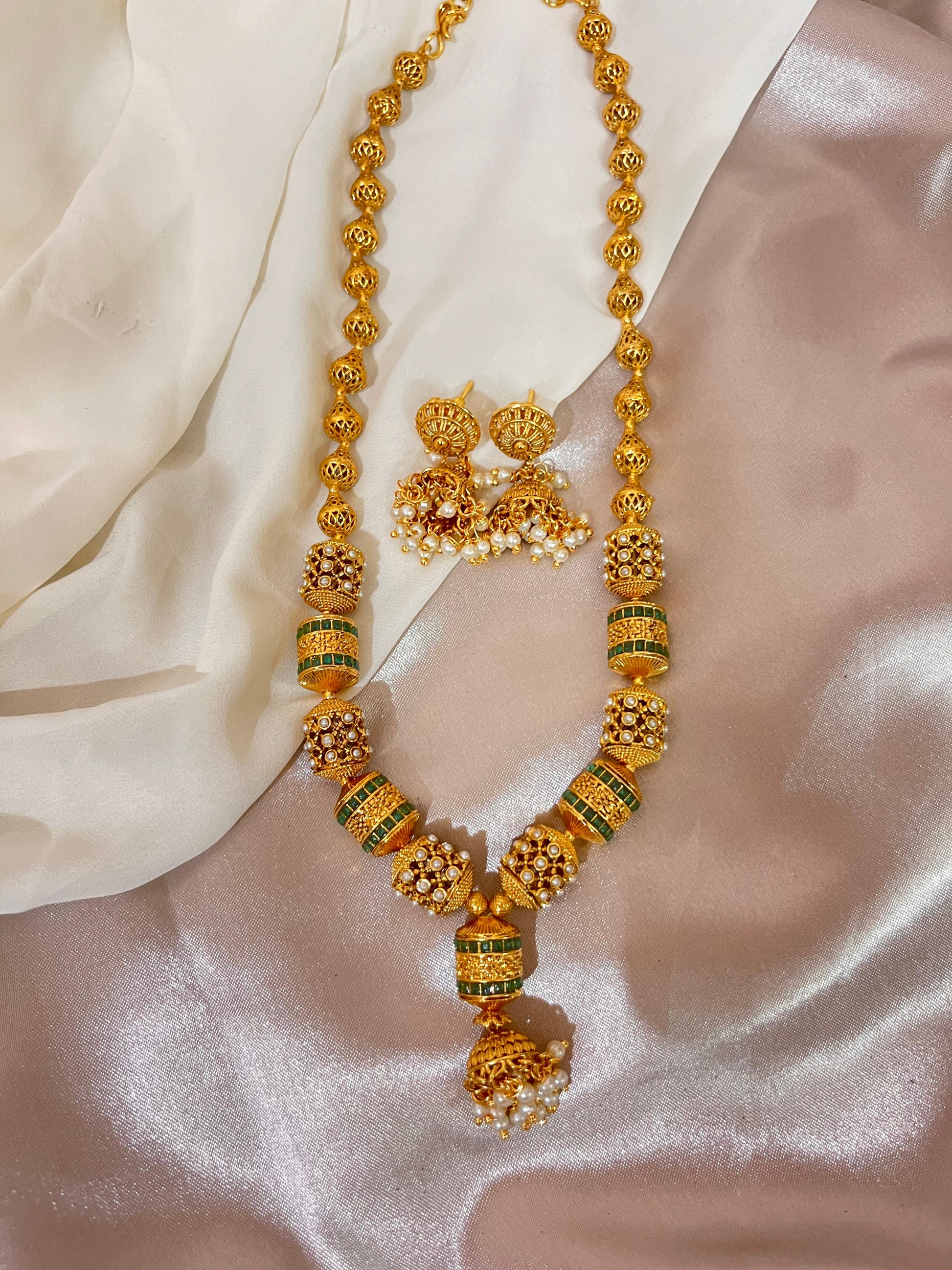 Adorn yourself with this captivating gold-plated necklace set. The design features a stunning combination of intricate gold beads and cylindrical sections adorned with vibrant green and sparkling white stones. The centerpiece is a single, beautiful jhumka, making this long necklace a perfect blend of modern and traditional style. The matching jhumka earrings complete this elegant look.