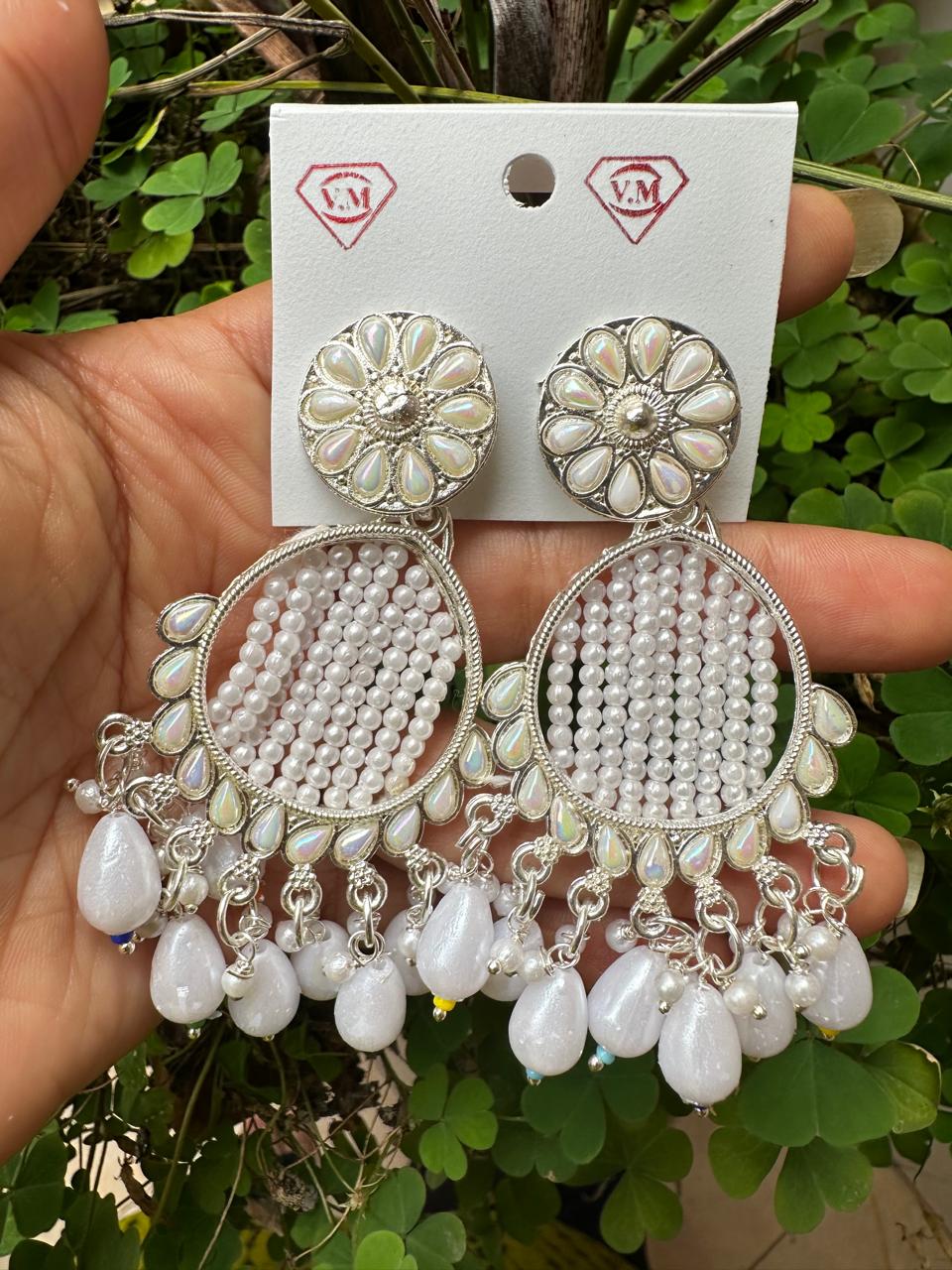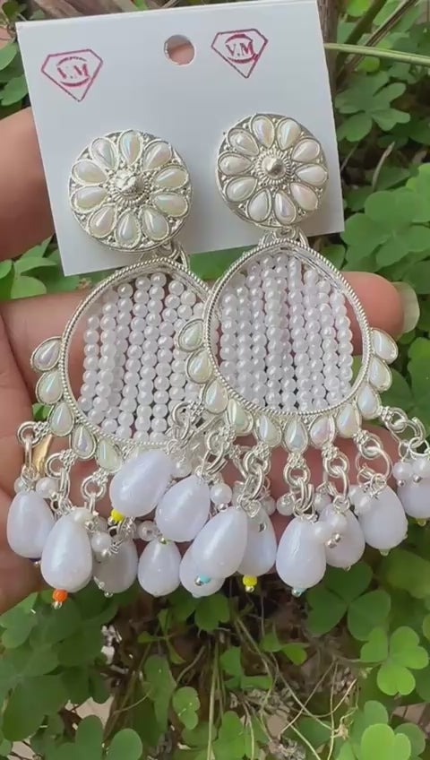 Adorn your ears with these exquisite oxidized silver jhumka earrings. The circular design is beautifully filled with cascading white beads, creating a stunning, intricate pattern. The top floral stud, also adorned with white beads, and the elegant hanging drops add a touch of grace and sophistication. These earrings are perfect for adding a touch of traditional elegance to any festive or formal outfit.